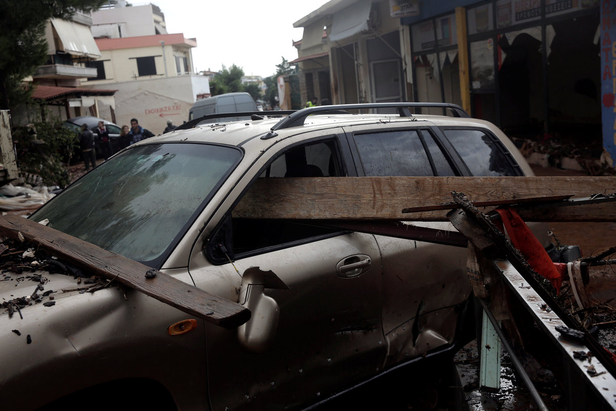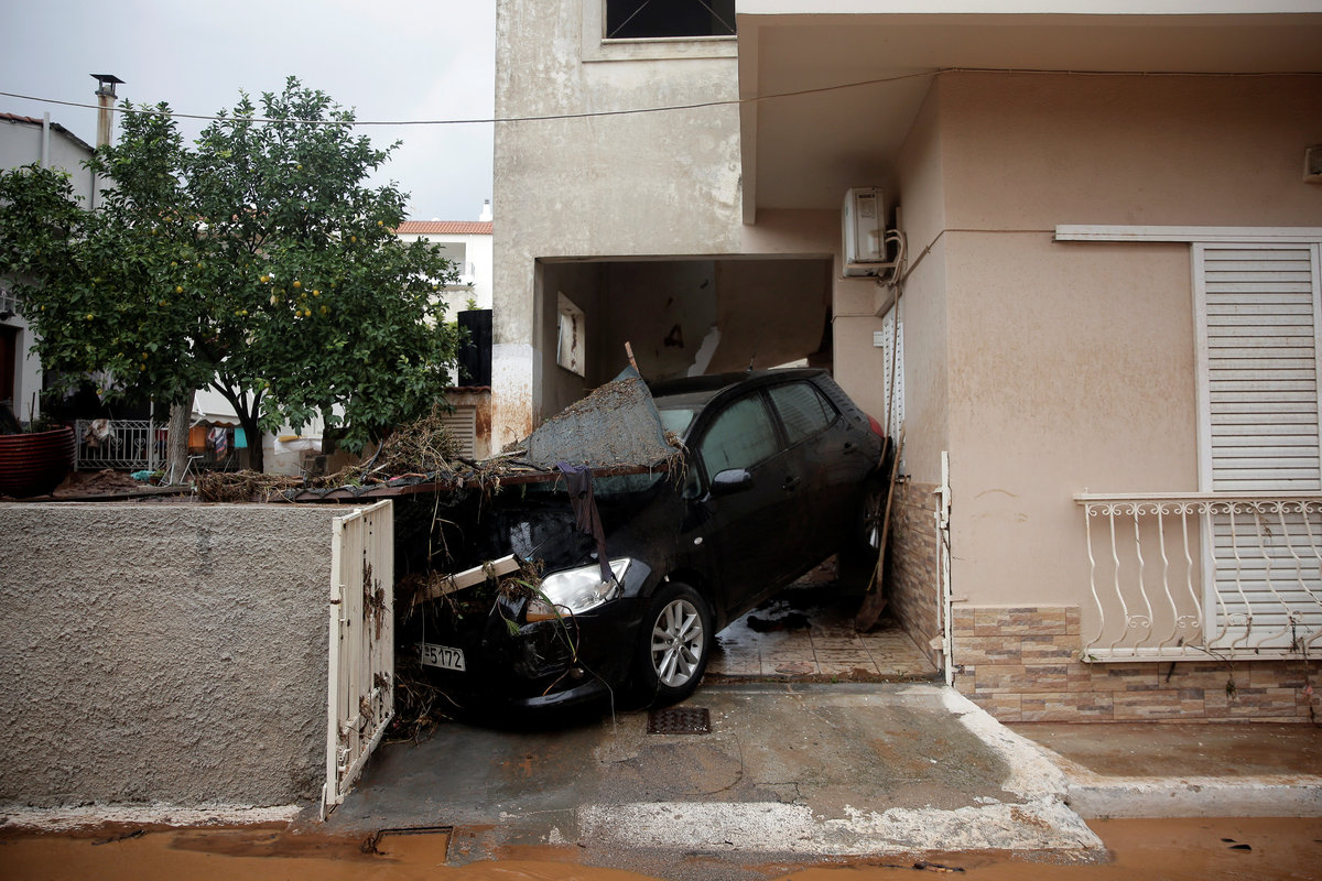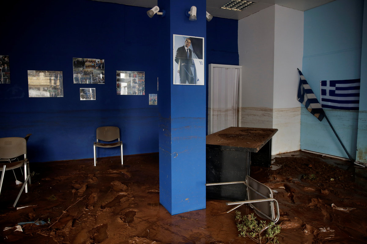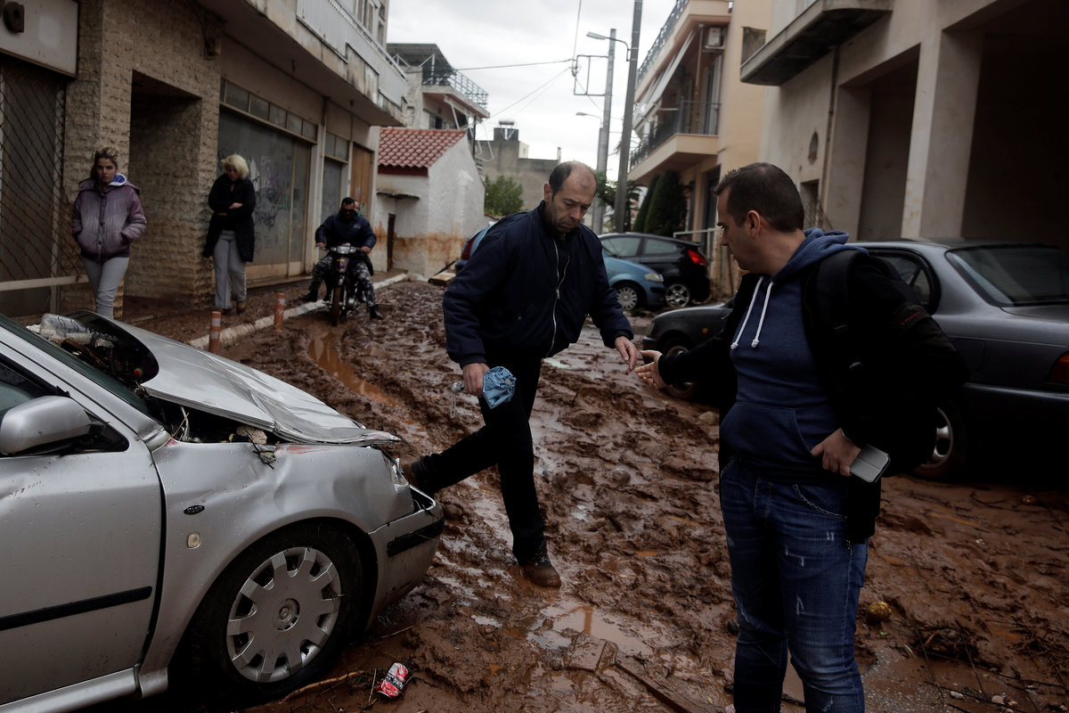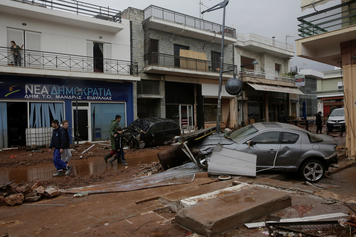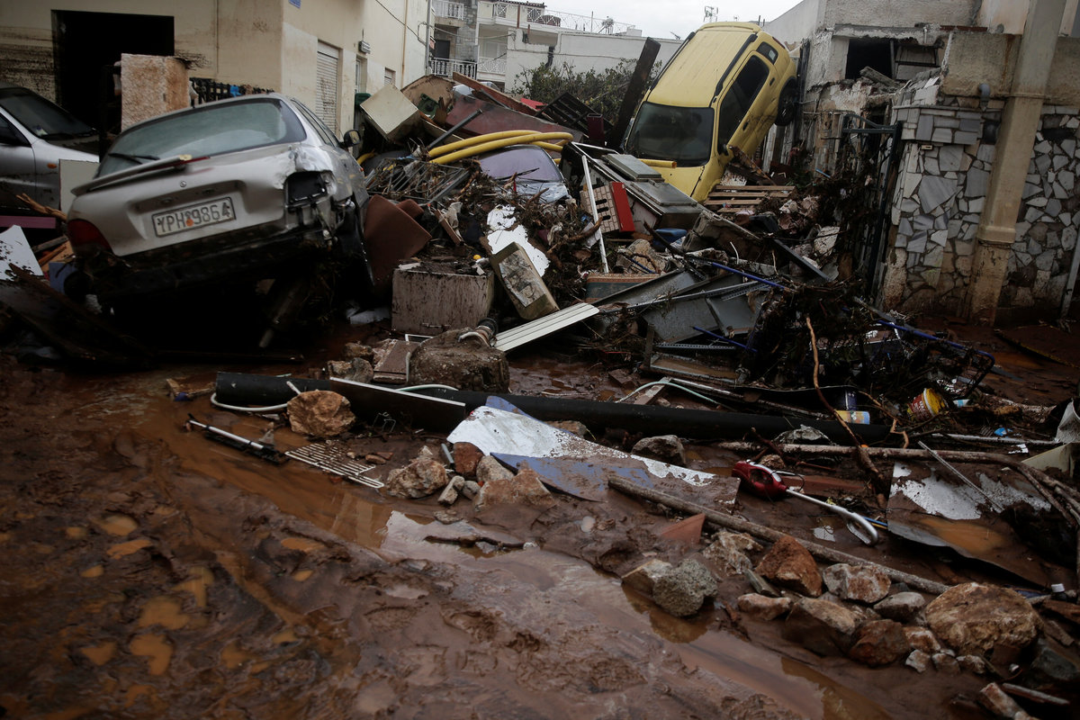 A local looks at debris piled up under her balcony following heavy rainfall in the town of Mandra, Greece, November 15, 2017. REUTERS/Alkis KonstantinidisDestroyed cars and debris are piled up among houses, following flash floods which hit areas west of Athens on November 15 killing at least 15 people, in Mandra, Greece, November 16, 2017. REUTERS/Alkis KonstantinidisA poster depicting a leader of Greek conservative New Democracy party Kyriakos Mitsotakis is seen on the wall as mud covers the floor of the party's local office, following flash floods which hit areas west of Athens on November 15 killing at least 15 people, in Mandra, Greece, November 16, 2017. REUTERS/Alkis KonstantinidisPeople walk past destroyed cars and shops, following flash floods which hit areas west of Athens on November 15 killing at least 15 people, in Mandra, Greece, November 16, 2017. REUTERS/Alkis KonstantinidisLocals wear plastic bags to protect from mud as they walk next to destroyed cars, following flash floods which hit areas west of Athens on November 15 killing at least 15 people, in Mandra, Greece, November 16, 2017. REUTERS/Alkis KonstantinidisA local looks on a blocked street behind debris following flash floods which hit areas west of Athens on November 15 killing at least 15 people, in Mandra, Greece, November 16, 2017. REUTERS/Alkis KonstantinidisA destroyed car is stuck at the entrance of a house following flash floods which hit areas west of Athens on November 15 killing at least 15 people, in Mandra, Greece, November 16, 2017. REUTERS/Alkis KonstantinidisA man and his son look for the documents of their destroyed car, following flash floods which hit areas west of Athens on November 15 killing at least 15 people, in Mandra, Greece, November 16, 2017. REUTERS/Alkis KonstantinidisMud covers the floor of the local offices of Greek conservative New Democracy party, as portraits of all leaders of the party and a Greek national flag hang on the wall, following flash floods which hit areas west of Athens on November 15 killing at least 15 people, in Mandra, Greece, November 16, 2017. REUTERS/Alkis KonstantinidisA TV set and curtains are stuck on a destroyed window of a flooded house, following flash floods which hit areas west of Athens on November 15 killing at least 15 people, in Mandra, Greece, November 16, 2017. REUTERS/Alkis KonstantinidisA worker holds a shovel next to a muddy road following flash floods which hit areas west of Athens on November 15 killing at least 15 people, in Nea Peramos, Greece, November 16, 2017. REUTERS/Alkis KonstantinidisMud is seen on the kitchen table in the house of Maria Kriada following flash floods which hit areas west of Athens on November 15 killing at least 15 people, in Nea Peramos, Greece, November 16, 2017. REUTERS/Alkis KonstantinidisA stop sign is seen on a destroyed road following flash floods which hit areas west of Athens on November 15 killing at least 15 people, in Nea Peramos, Greece, November 16, 2017. REUTERS/Alkis KonstantinidisA beach umbrella lies on the muddy seaside following flash floods which hit areas west of Athens on November 15 killing at least 15 people, in Nea Peramos, Greece, November 16, 2017. REUTERS/Alkis KonstantinidisA local, carrying a dog in his jacket, saves a cat that was trapped in a tree, following a heavy rainfall in the town of Mandra, Greece. REUTERS/Alkis KonstantinidisLocals walk among destroyed cars on a muddy street, following flash floods which hit areas west of Athens on November 15 killing at least 15 people, in Mandra, Greece, November 16, 2017. REUTERS/Alkis KonstantinidisMaria Kriada is comforted outside her destroyed house following flash floods which hit areas west of Athens on November 15 killing at least 15 people, in Nea Peramos, Greece, November 16, 2017. REUTERS/Alkis Konstantinidis