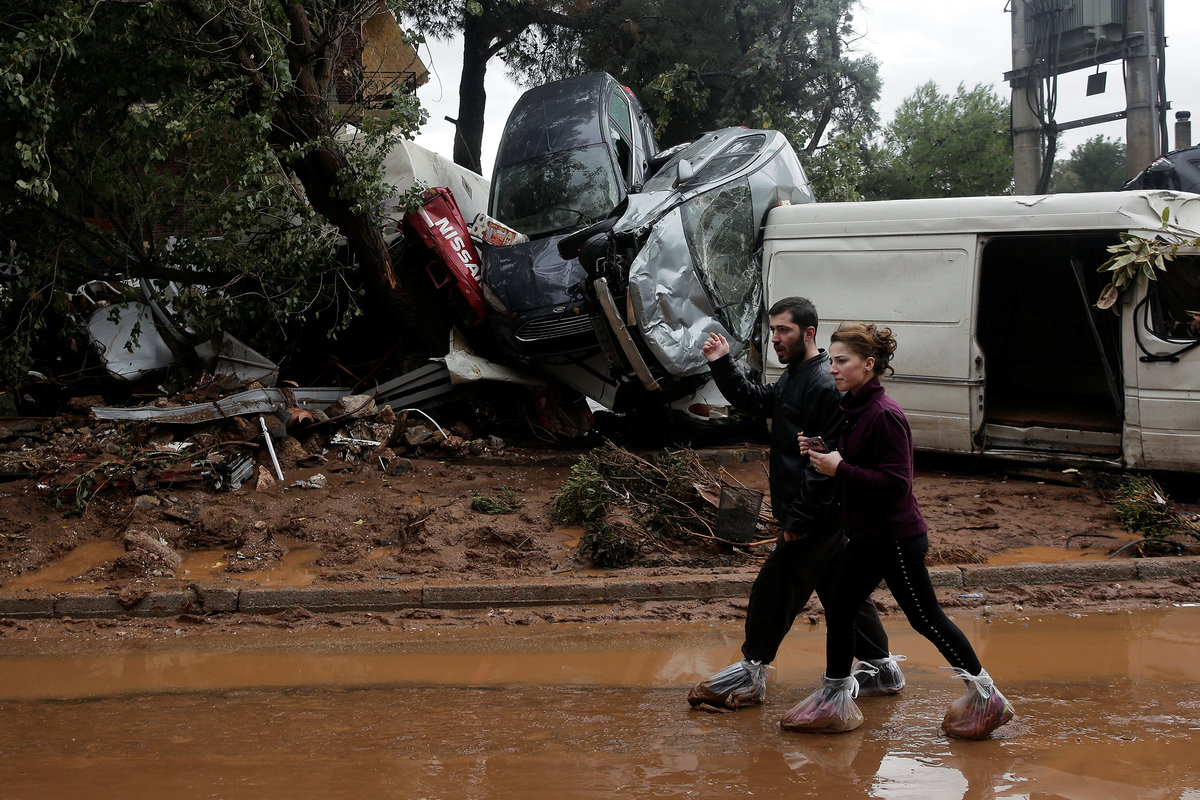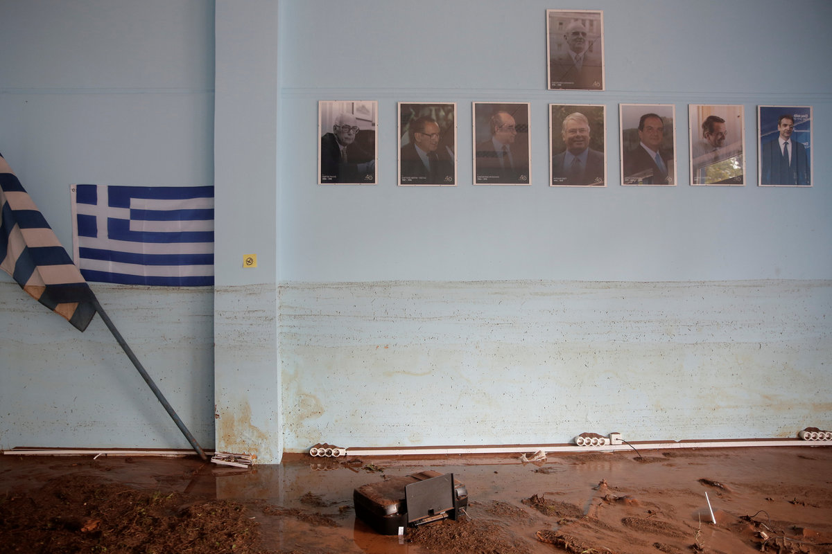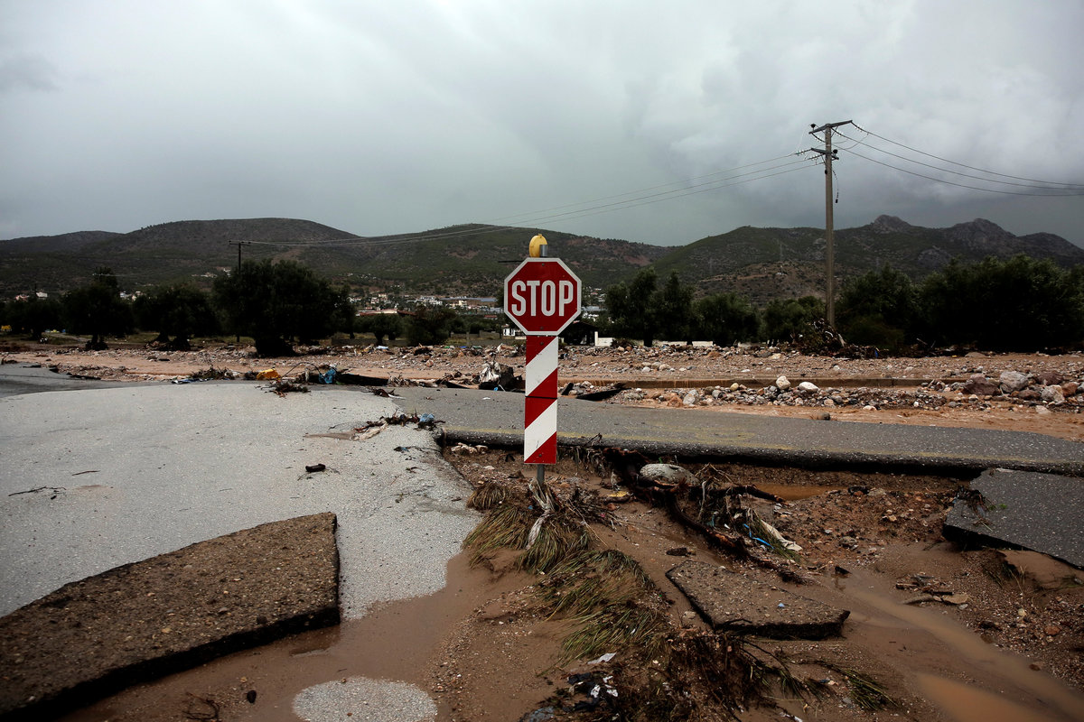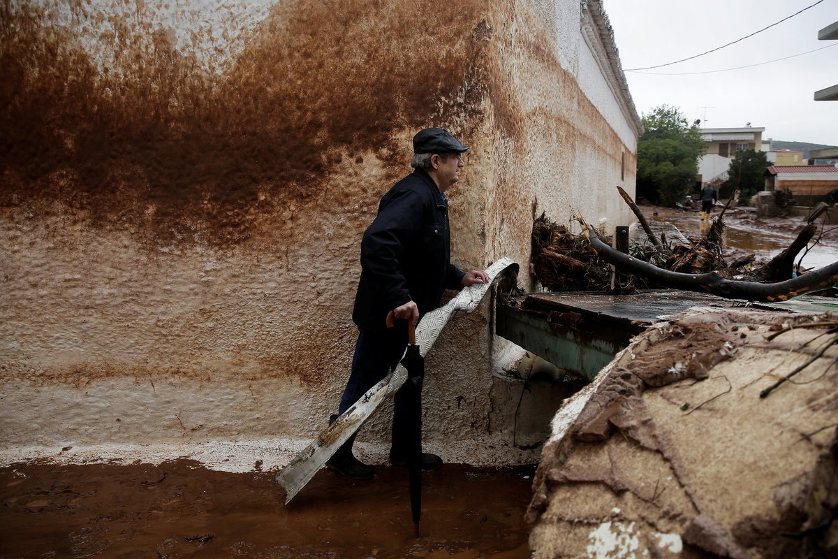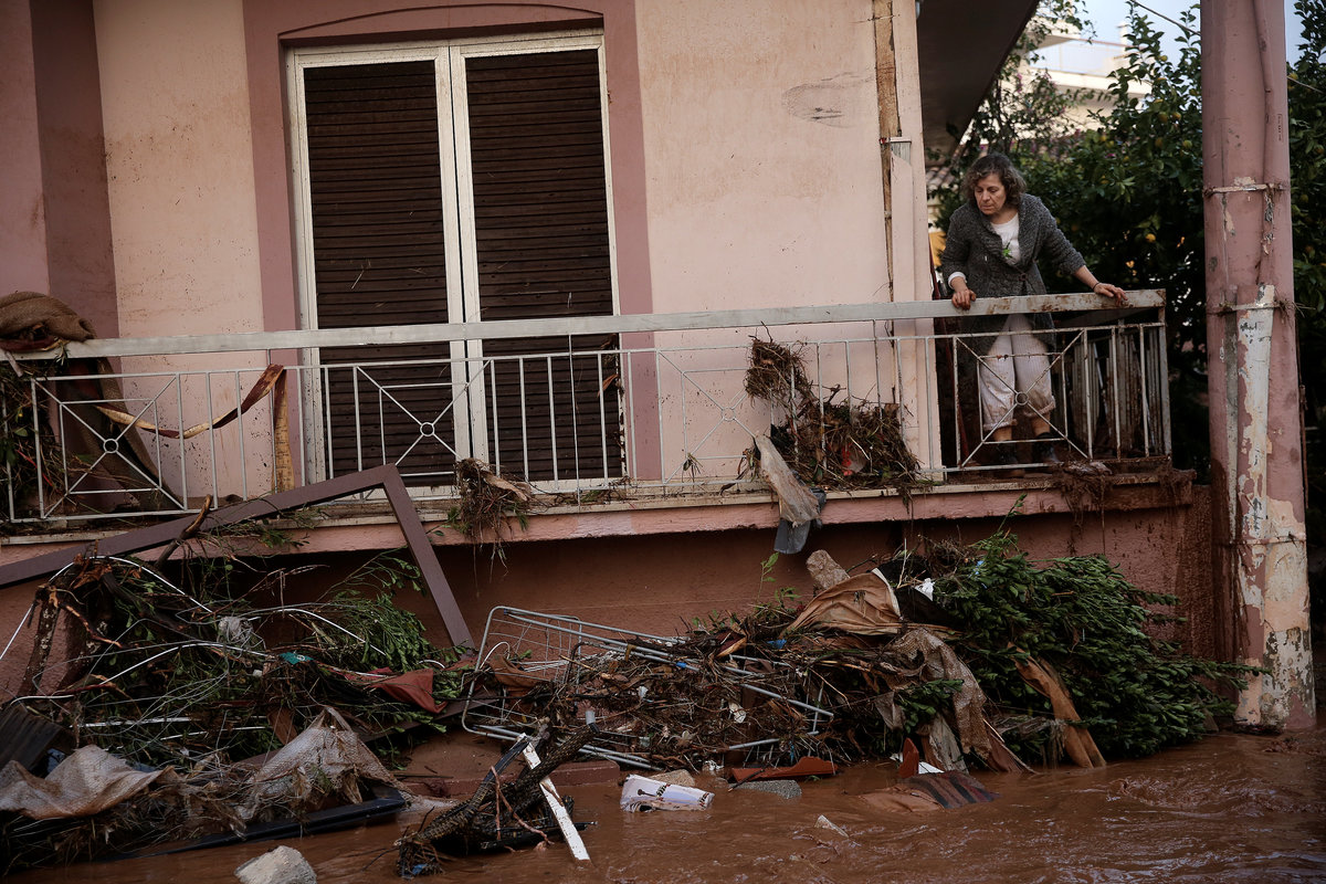 A local looks at debris piled up under her balcony following heavy rainfall in the town of Mandra, Greece, November 15, 2017. REUTERS/Alkis KonstantinidisDestroyed cars and debris are piled up among houses, following flash floods which hit areas west of Athens on November 15 killing at least 15 people, in Mandra, Greece, November 16, 2017. REUTERS/Alkis KonstantinidisA poster depicting a leader of Greek conservative New Democracy party Kyriakos Mitsotakis is seen on the wall as mud covers the floor of the party's local office, following flash floods which hit areas west of Athens on November 15 killing at least 15 people, in Mandra, Greece, November 16, 2017. REUTERS/Alkis KonstantinidisPeople walk past destroyed cars and shops, following flash floods which hit areas west of Athens on November 15 killing at least 15 people, in Mandra, Greece, November 16, 2017. REUTERS/Alkis KonstantinidisLocals wear plastic bags to protect from mud as they walk next to destroyed cars, following flash floods which hit areas west of Athens on November 15 killing at least 15 people, in Mandra, Greece, November 16, 2017. REUTERS/Alkis KonstantinidisA local looks on a blocked street behind debris following flash floods which hit areas west of Athens on November 15 killing at least 15 people, in Mandra, Greece, November 16, 2017. REUTERS/Alkis KonstantinidisA destroyed car is stuck at the entrance of a house following flash floods which hit areas west of Athens on November 15 killing at least 15 people, in Mandra, Greece, November 16, 2017. REUTERS/Alkis KonstantinidisA man and his son look for the documents of their destroyed car, following flash floods which hit areas west of Athens on November 15 killing at least 15 people, in Mandra, Greece, November 16, 2017. REUTERS/Alkis KonstantinidisMud covers the floor of the local offices of Greek conservative New Democracy party, as portraits of all leaders of the party and a Greek national flag hang on the wall, following flash floods which hit areas west of Athens on November 15 killing at least 15 people, in Mandra, Greece, November 16, 2017. REUTERS/Alkis KonstantinidisA TV set and curtains are stuck on a destroyed window of a flooded house, following flash floods which hit areas west of Athens on November 15 killing at least 15 people, in Mandra, Greece, November 16, 2017. REUTERS/Alkis KonstantinidisA worker holds a shovel next to a muddy road following flash floods which hit areas west of Athens on November 15 killing at least 15 people, in Nea Peramos, Greece, November 16, 2017. REUTERS/Alkis KonstantinidisMud is seen on the kitchen table in the house of Maria Kriada following flash floods which hit areas west of Athens on November 15 killing at least 15 people, in Nea Peramos, Greece, November 16, 2017. REUTERS/Alkis KonstantinidisA stop sign is seen on a destroyed road following flash floods which hit areas west of Athens on November 15 killing at least 15 people, in Nea Peramos, Greece, November 16, 2017. REUTERS/Alkis KonstantinidisA beach umbrella lies on the muddy seaside following flash floods which hit areas west of Athens on November 15 killing at least 15 people, in Nea Peramos, Greece, November 16, 2017. REUTERS/Alkis KonstantinidisA local, carrying a dog in his jacket, saves a cat that was trapped in a tree, following a heavy rainfall in the town of Mandra, Greece. REUTERS/Alkis KonstantinidisLocals walk among destroyed cars on a muddy street, following flash floods which hit areas west of Athens on November 15 killing at least 15 people, in Mandra, Greece, November 16, 2017. REUTERS/Alkis KonstantinidisMaria Kriada is comforted outside her destroyed house following flash floods which hit areas west of Athens on November 15 killing at least 15 people, in Nea Peramos, Greece, November 16, 2017. REUTERS/Alkis Konstantinidis