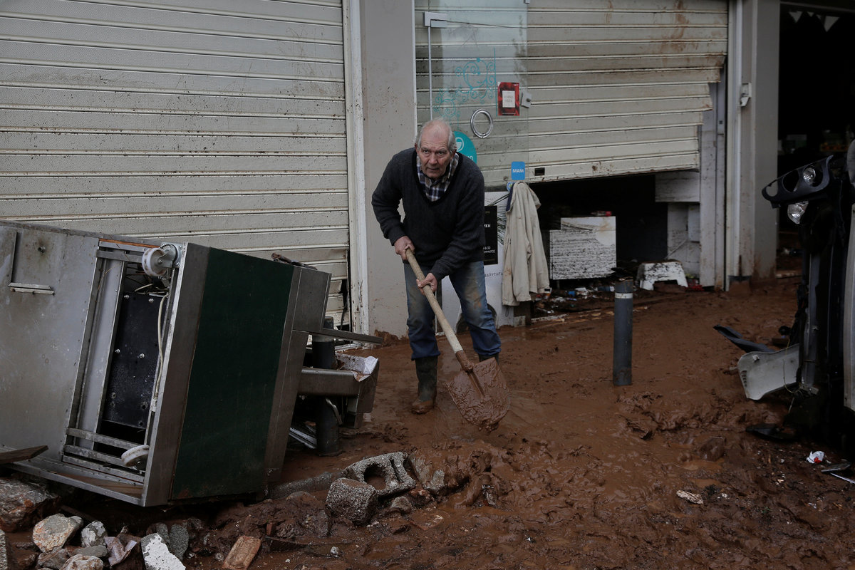 A local shovels mud from the entrance of his shop, following flash floods which hit areas west of Athens on November 15 killing at least 15 people, in Mandra, Greece, November 16, 2017. REUTERS/Alkis Konstantinidis