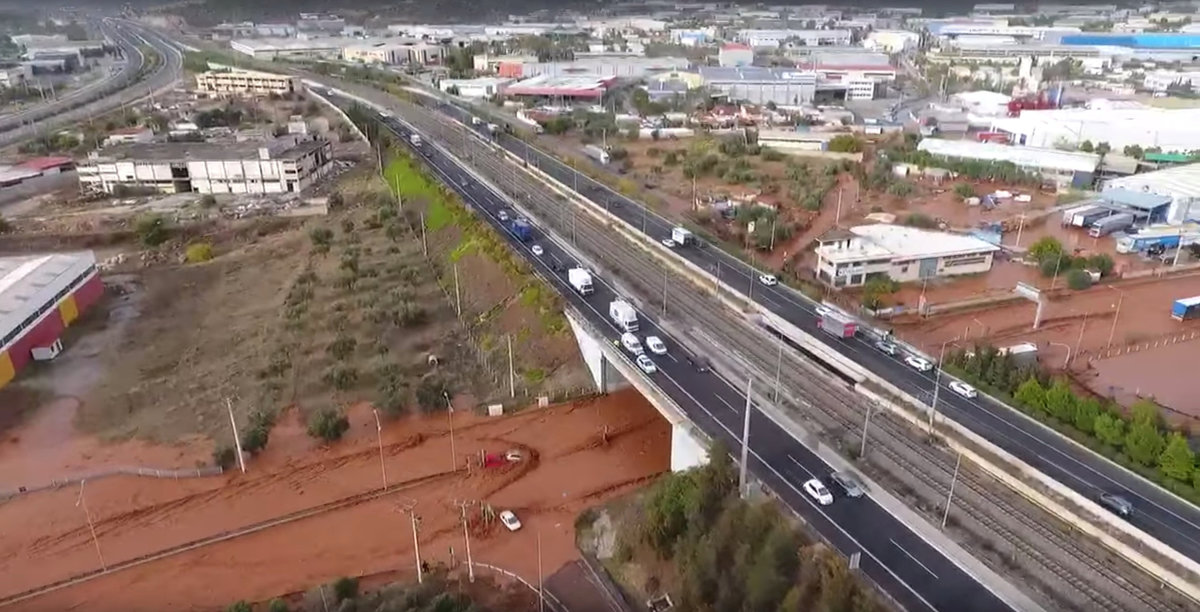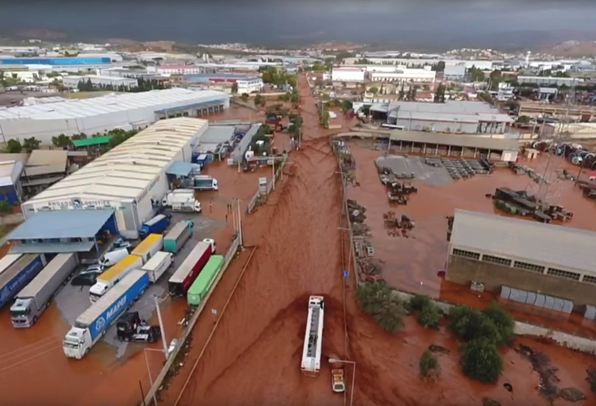 General aerial view of a flooded area following flash floods in Mandra, West Attica, Greece November 15, 2017 in this still image taken from social media video. NATIONAL AND KAPODISTRIAN UNIVERSITY OF ATHENS/via REUTERS