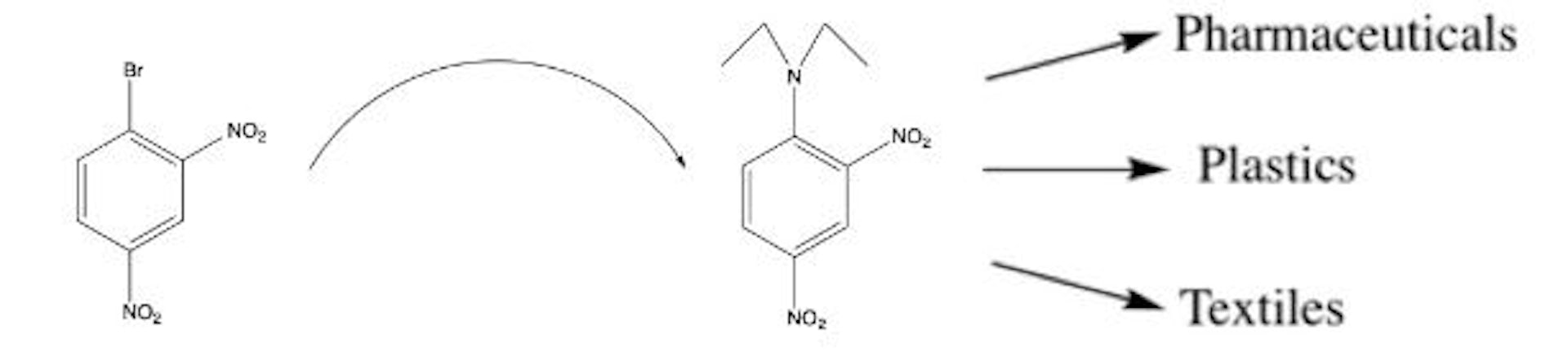 Now, the environmental impact resulting from a reaction such as this is not usually the target compound itself (2,4-dinitro-N,N-diethylaniline). Rather, the related hazards are more likely to be the reagents, solvents and energy that are necessary for the successful transformation. This experiment traditionally uses toluene as a solvent, which is toxic, and requires a catalyst called tetrabutylammonium bromide (TBAB). There’s also the energy necessary to boil toluene for an hour to a high boiling point.