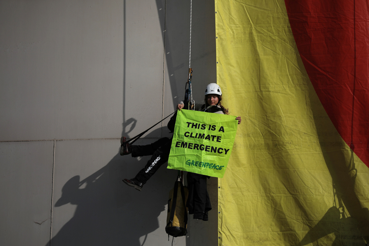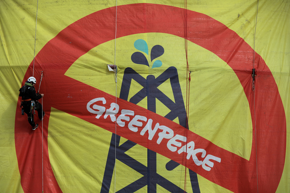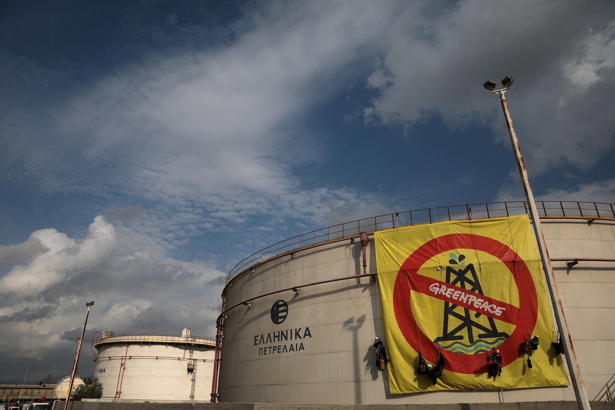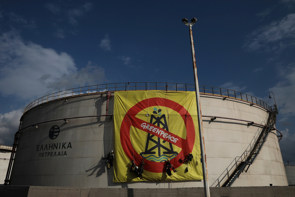 ATHENS (Reuters) - Greenpeace activists abseiled down the side of huge storage tank at a Hellenic Petroleum refinery near Athens on Thursday and unfurled a huge banner protesting at the company's oil and gas exploration projects across Greece.