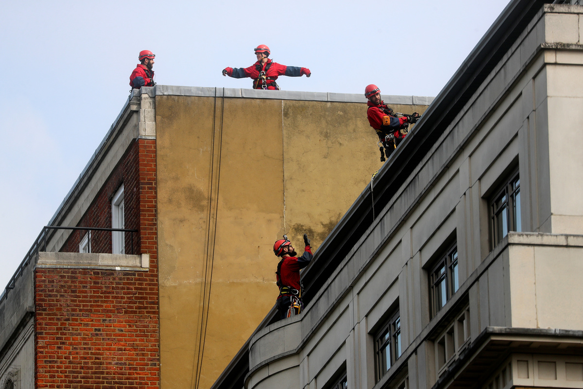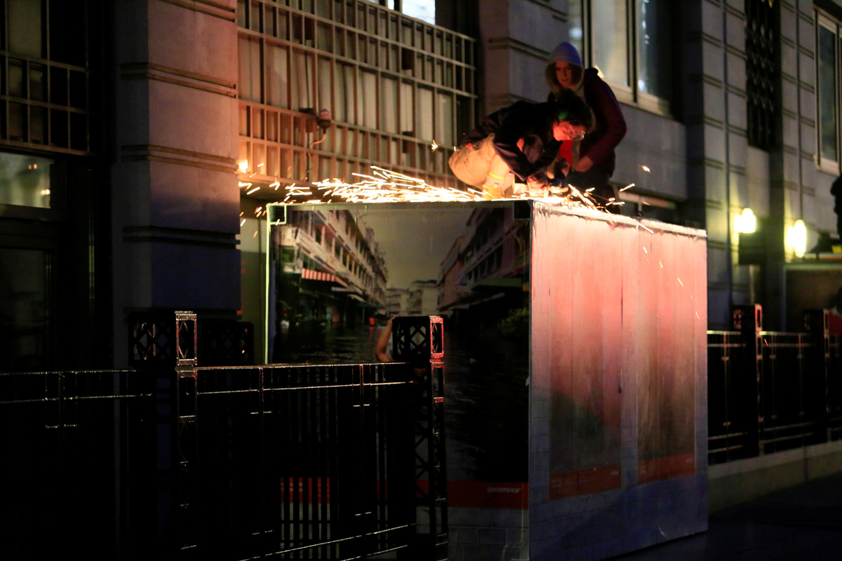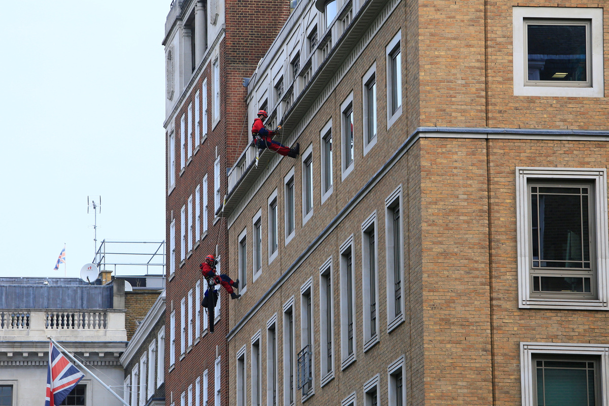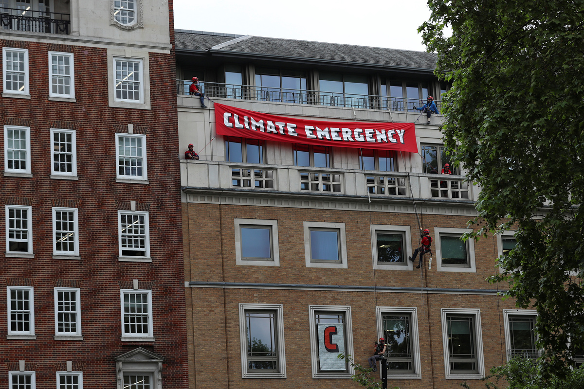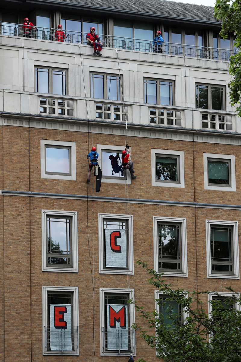 A team of activists abseiled from the top of the building and placed huge letters over the windows reading 'CLIMATE EMERGENCY'.
