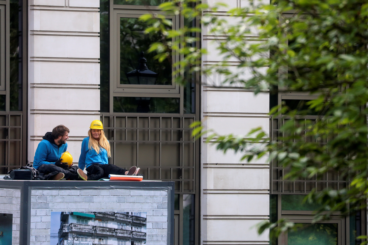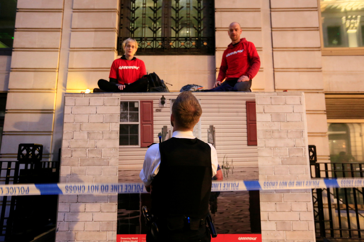 Greenpeace activists arrived at the building in St James' Square in central London at 0200 GMT and encased themselves in specially designed containers to block all of the main entrances.