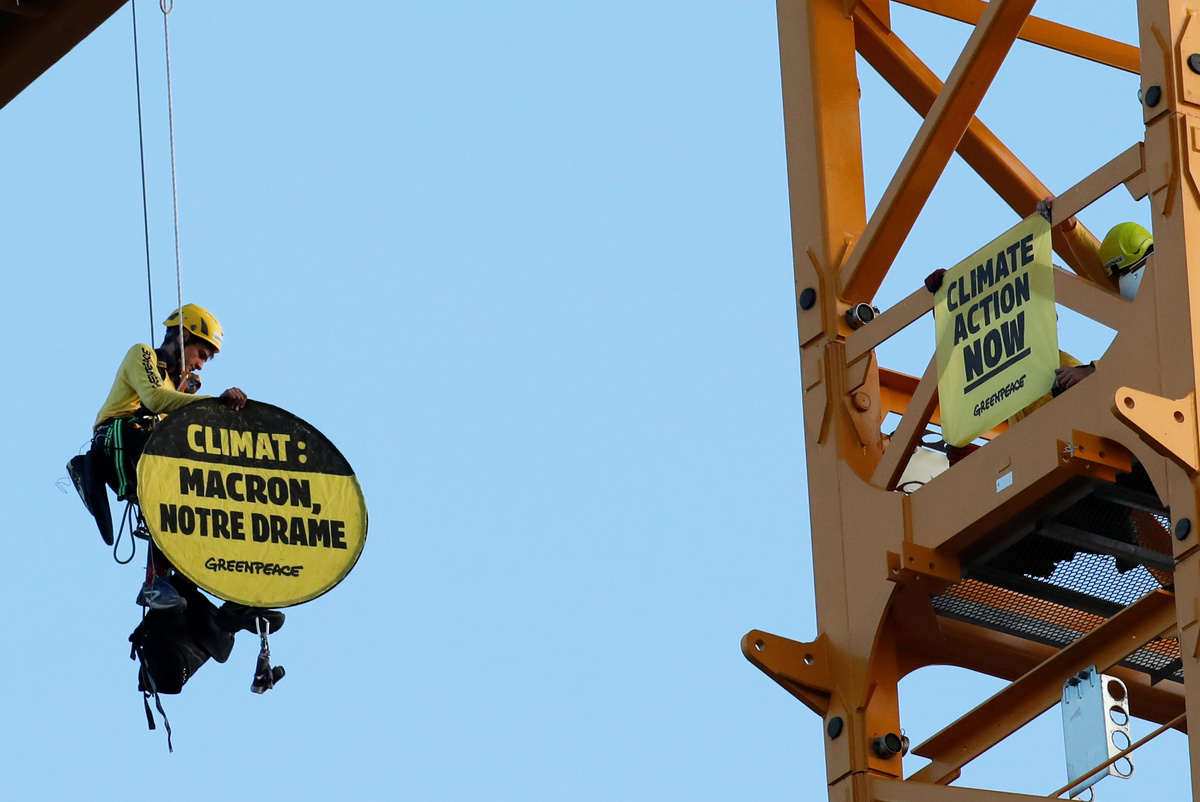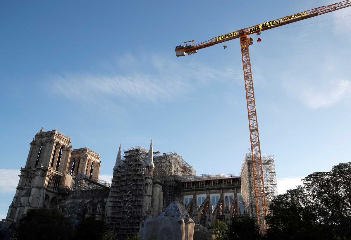 Greenpeace activists on Thursday hung a banner reading "Climate: Time to Act!" from a crane towering over the fire-damaged Notre-Dame Cathedral in Paris.