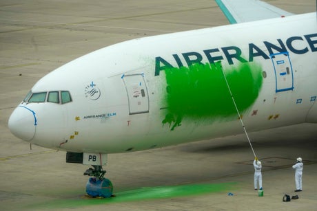 With an extendable paint roller, they painted on one side of an Air France Boeing 777, which was parked without passengers, before climbing on the jet. Several of the activists refused to climb down off the plane despite orders from security personnel.
