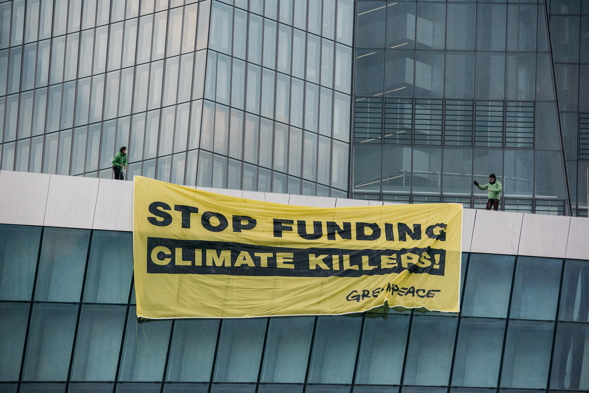 After flying over the Main river in Frankfurt, the two activists landed at the low-rise ECB complex and unfurled a banner that demanded the ECB "stop funding climate killers".