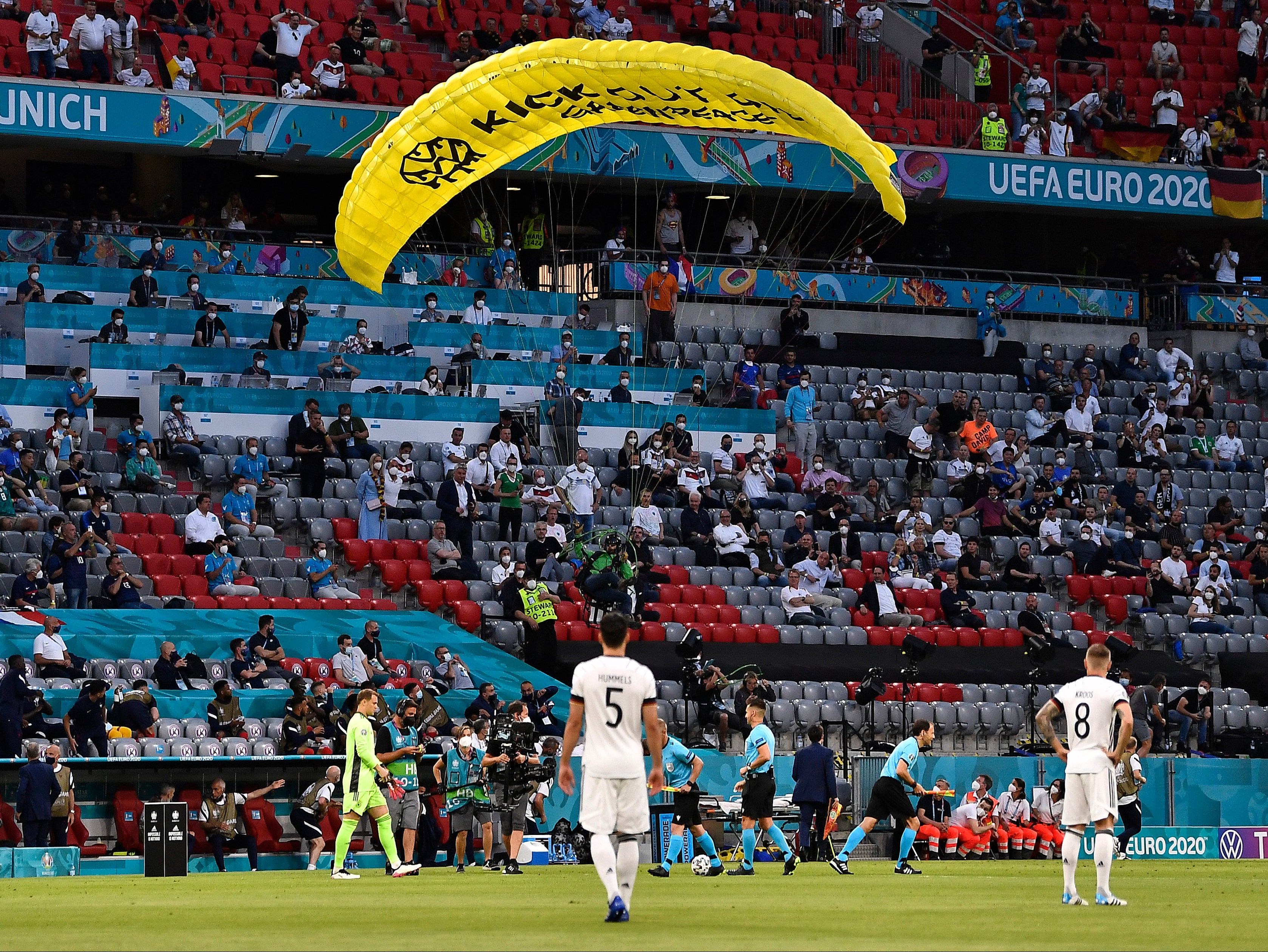 “The paraglider was supposed to go over the stadium and let a soft ball float down to the pitch with a protest message to EURO 2020 sponsor Volkswagen.