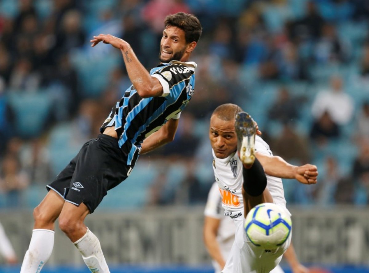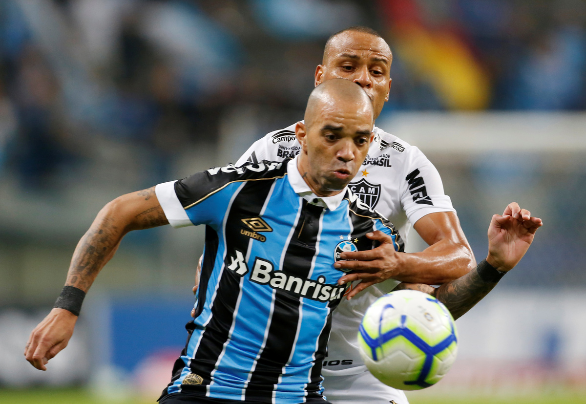 Soccer Football - Brasileiro Championship - Gremio v Atletico Mineiro - Arena do Gremio, Porto Alegre, Brazil - May 25, 2019 Atletico Mineiro’s Leonardo Silva in action with Gremio’s Juninho Capixaba REUTERS/Diego Vara