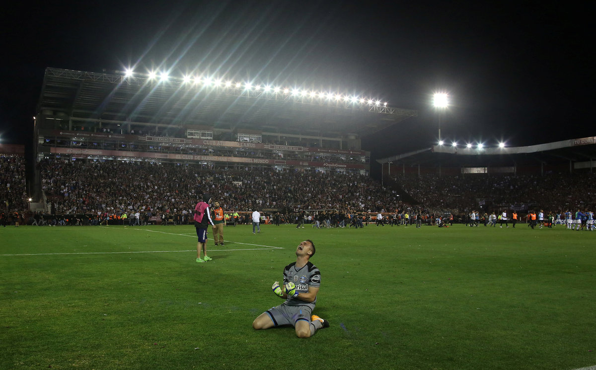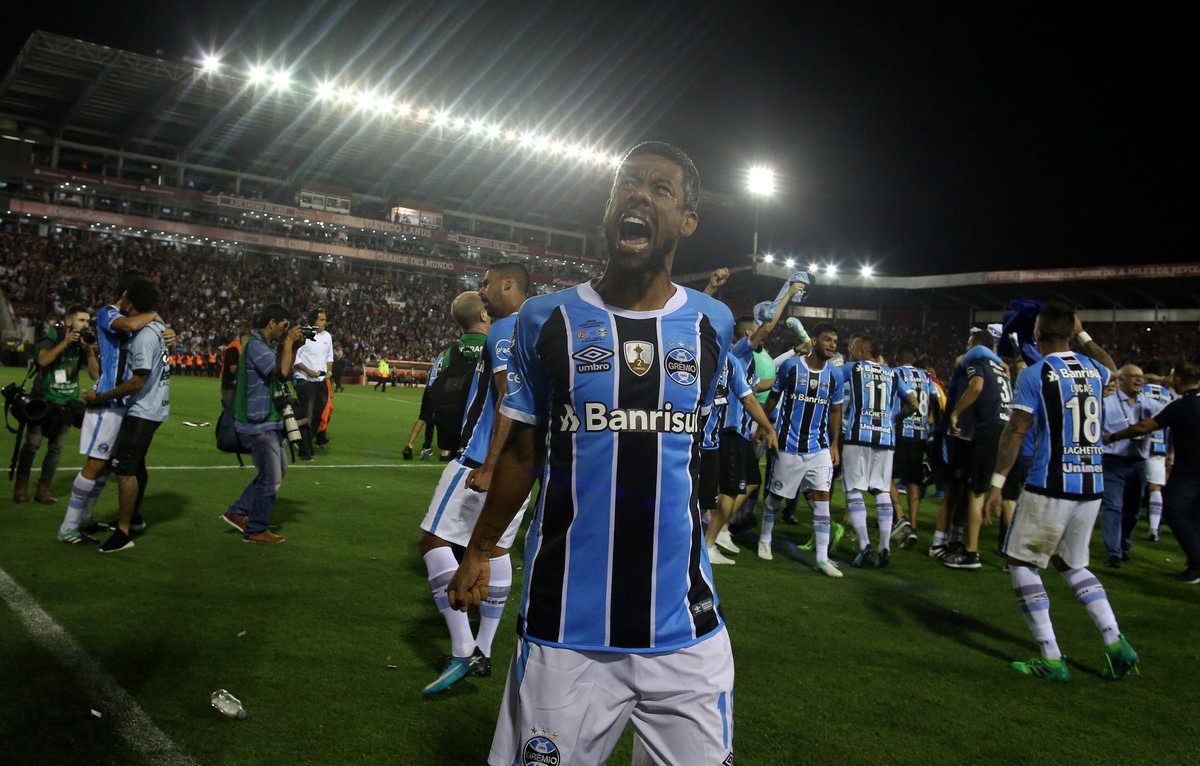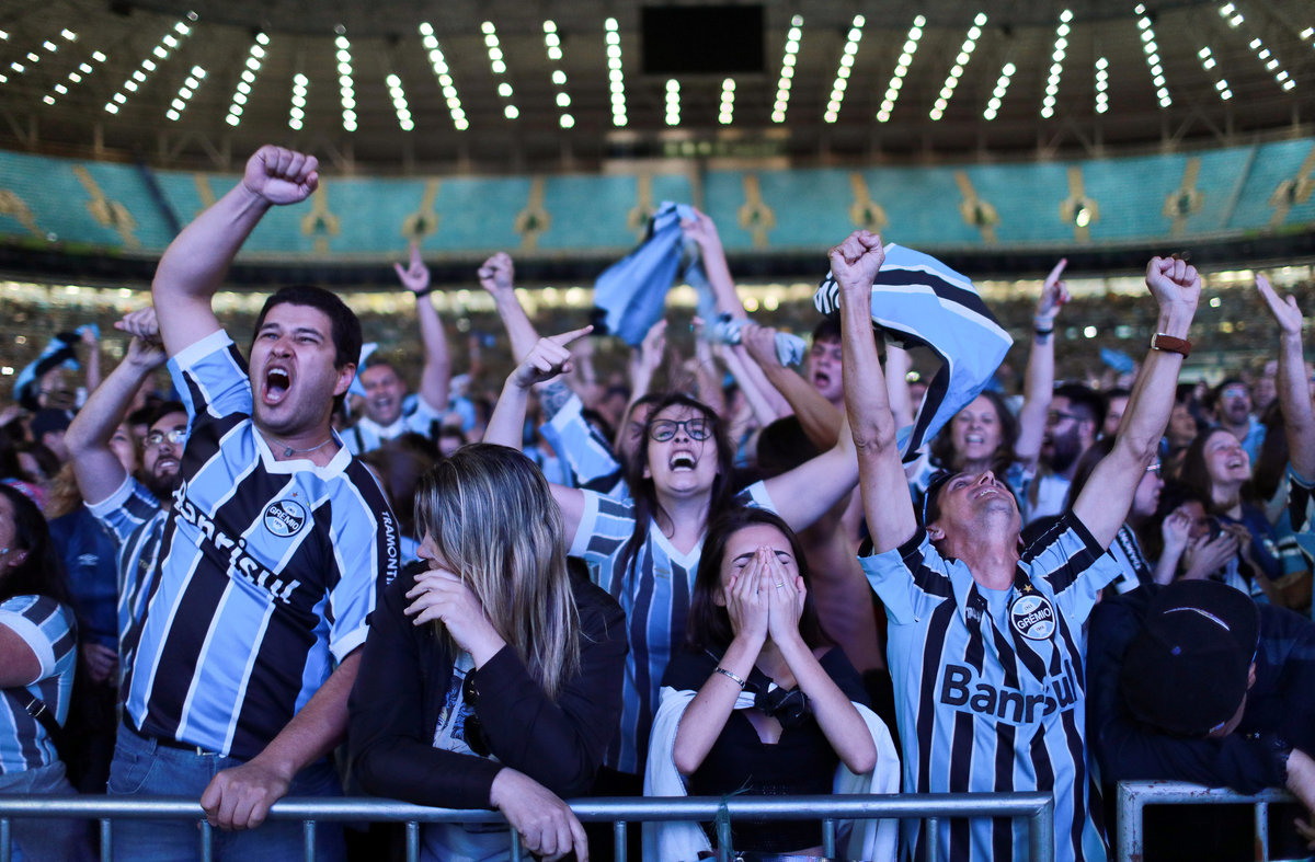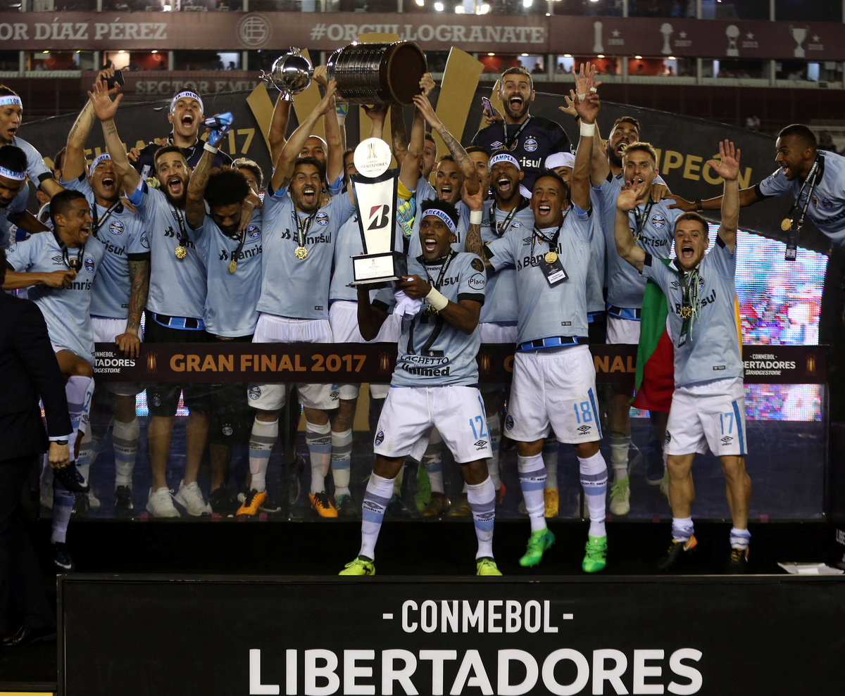 Soccer Football - Argentina's Lanus v Brazil's Gremio - Copa Libertadores Final - Ciudad de Lanus stadium, Lanus, Argentina - November 29, 2017. Gremio's Fernandinho celebrates after scoring. REUTERS/Agustin MarcarianSoccer Football - Copa Libertadores Final - Argentina’s Lanus v Gremio - Ciudad de Lanus stadium, Lanus, Argentina - November 29, 2017 - Gremio's Lucas Barrios and Lanus' Maximiliano Velazquez in action. REUTERS/Marcos BrindicciSoccer Football - Copa Libertadores Final - Argentina’s Lanus v Brazil's Gremio - Ciudad de Lanus stadium, Lanus, Argentina - November 29, 2017. Referee Enrique Caceres of Paraguay shows Gremio's Ramiro a red card. REUTERS/Marcos BrindicciSoccer Football - Copa Libertadores Final - Argentina’s Lanus v Brazil's Gremio - Ciudad de Lanus stadium, Lanus, Argentina - November 29, 2017. Lanus' Jose Sand and Gremio's Bressan in action. REUTERS/Marcos BrindicciSoccer Football - Argentina's Lanus v Brazil's Gremio - Copa Libertadores Final - Ciudad de Lanus stadium, Lanus, Argentina - November 29, 2017. Gremio's Luan scores a goal. REUTERS/Agustin MarcarianSoccer Football - Argentina's Lanus v Brazil's Gremio - Copa Libertadores Final - Ciudad de Lanus stadium, Lanus, Argentina - November 29, 2017. Gremio's Luan (C) celebrate after scoring. REUTERS/Agustin MarcarianSoccer Football - Copa Libertadores Final - Argentina's Lanus v Brazil's Gremio - Arena do Gremio, Porto Alegre, Brazil - November 29, 2017. Gremio fans react after their team goal as they watch the Copa Libertadores final match on a giant screen. REUTERS/Diego VaraSoccer Football - Copa Libertadores Final - Argentina’s Lanus v Gremio - Ciudad de Lanus stadium, Lanus, Argentina - November 29, 2017 - Lanus' goalkeeper Esteban Andrada reacts after receiving a goal. REUTERS/Marcos BrindicciSoccer Football - Argentina's Lanus v Brazil's Gremio - Copa Libertadores Final - Ciudad de Lanus stadium, Lanus, Argentina - November 29, 2017. Gremio's Marcelo Grohe celebrates at the end of the match. REUTERS/Agustin MarcarianSoccer Football - Copa Libertadores Final - Argentina’s Lanus v Brazil's Gremio - Ciudad de Lanus stadium, Lanus, Argentina - November 29, 2017 - Gremio players react as they win the match. REUTERS/Marcos BrindicciSoccer Football - Argentina's Lanus v Brazil's Gremio - Copa Libertadores Final - Ciudad de Lanus stadium, Lanus, Argentina - November 29, 2017. Gremio's Leonardo Moura celebrates at the end of the match. REUTERS/Agustin MarcarianSoccer Football - Copa Libertadores Final - Argentina's Lanus v Brazil's Gremio - Arena do Gremio, Porto Alegre, Brazil - November 29, 2017. Gremio fans celebrate after their team won the Copa Libertadores final match. REUTERS/Diego VaraSoccer Football - Argentina's Lanus v Brazil's Gremio - Copa Libertadores Final - Ciudad de Lanus stadium, Lanus, Argentina - November 29, 2017. Gremio's coach Renato Gaucho celebrates at the end of the match. REUTERS/Agustin MarcarianSoccer Football - Copa Libertadores Final - Argentina’s Lanus v Brazil's Gremio - Ciudad de Lanus stadium, Lanus, Argentina - November 29, 2017 - Lanus' players stand together after losing their match. REUTERS/Marcos BrindicciSoccer Football - Argentina's Lanus v Brazil's Gremio - Copa Libertadores Final - Ciudad de Lanus stadium, Lanus, Argentina - November 29, 2017. Gremio's Jael celebrate with the trophy. REUTERS/Agustin MarcarianSoccer Football - Copa Libertadores Final - Argentina’s Lanus v Brazil's Gremio - Ciudad de Lanus stadium, Lanus, Argentina - November 29, 2017 - Gremio players celebrate with the trophy. REUTERS/Marcos Brindicci