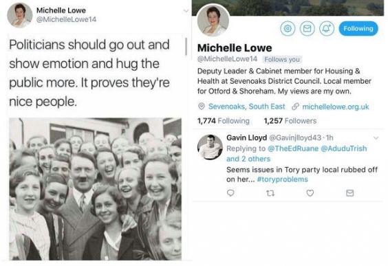 Michelle Lowe, who lost to Labour in the recent election by a decisive margin, shared a photo of the Nazi leader smiling and hugging members of the public on Twitter on Monday evening. She sarcastically wrote: “Politicians should go out and show emotion”.