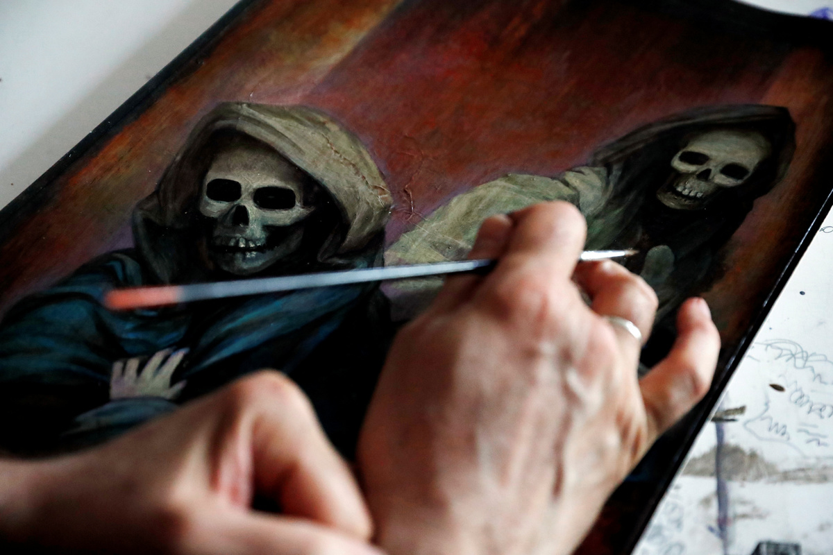 Before he painted with a plan in his mind, but now images of skulls, burning heads and pained faces simply flow from his brush. Unintentionally, some of the faces in his paintings reflect the features of lost ones, he said.