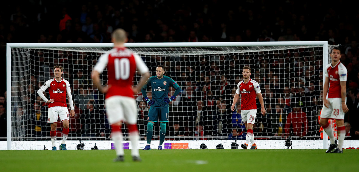 Soccer Football - Europa League Semi Final First Leg - Arsenal vs Atletico Madrid - Emirates Stadium, London, Britain - April 26, 2018 Arsenal's Nacho Monreal, David Ospina and Shkodran Mustafi look dejected after Atletico Madrid's Antoine Griezmann (not pictured) scored their first goal REUTERS/Eddie Keogh