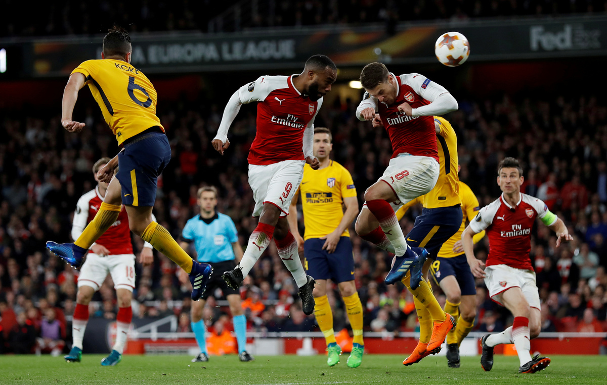 Soccer Football - Europa League Semi Final First Leg - Arsenal vs Atletico Madrid - Emirates Stadium, London, Britain - April 26, 2018 Atletico Madrid's Antoine Griezmann celebrates scoring their first goal REUTERS/Dylan Martinez Soccer Football - Europa League Semi Final First Leg - Arsenal vs Atletico Madrid - Emirates Stadium, London, Britain - April 26, 2018 Arsenal's Alexandre Lacazette celebrates scoring their first goal REUTERS/Eddie Keogh Soccer Football - Europa League Semi Final First Leg - Arsenal vs Atletico Madrid - Emirates Stadium, London, Britain - April 26, 2018 Arsenal manager Arsene Wenger gestures REUTERS/Eddie Keogh Soccer Football - Europa League Semi Final First Leg - Arsenal vs Atletico Madrid - Emirates Stadium, London, Britain - April 26, 2018 Arsenal's Shkodran Mustafi reacts after the game REUTERS/Dylan Martinez