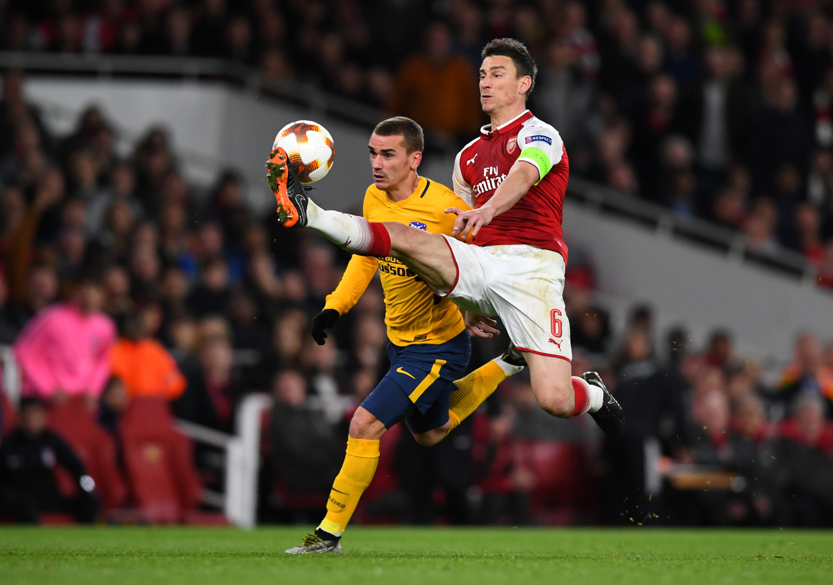 Soccer Football - Europa League Semi Final First Leg - Arsenal vs Atletico Madrid - Emirates Stadium, London, Britain - April 26, 2018 Atletico Madrid's Antoine Griezmann in action with Arsenal's Laurent Koscielny before scoring their first goal REUTERS/Dylan Martinez