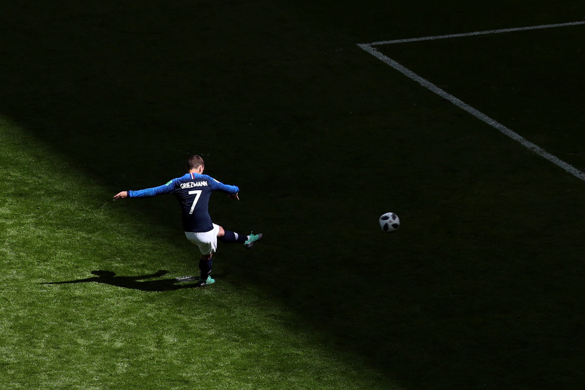 France striker Antoine Griezmann scored from the first-ever penalty awarded by the Video Assistant Referee (VAR) at a World Cup after he was brought down by a sliding challenge from Socceroos defender Josh Risdon just inside the box.
