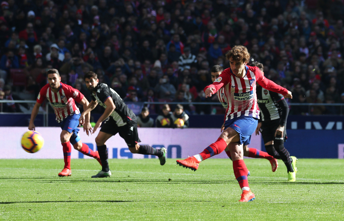 Griezmann smashed home from the penalty spot in the 57th minute to score for the fifth consecutive game in all competitions after Levante midfielder Nikola Vukcevic was penalised for handball in the area.