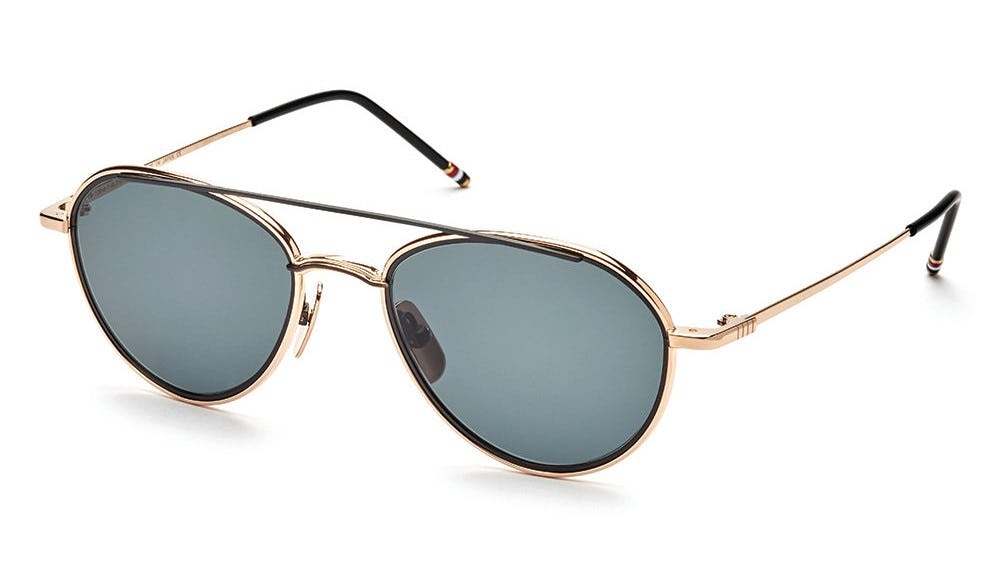 These Thom Browne Aviator Sunglasses are the perfect final touch on any outfit. Designed with an aviator frame, drill mount lens, and tri-color temple tips, Thom Browne Eyewear is a refined touch for a refined taste.