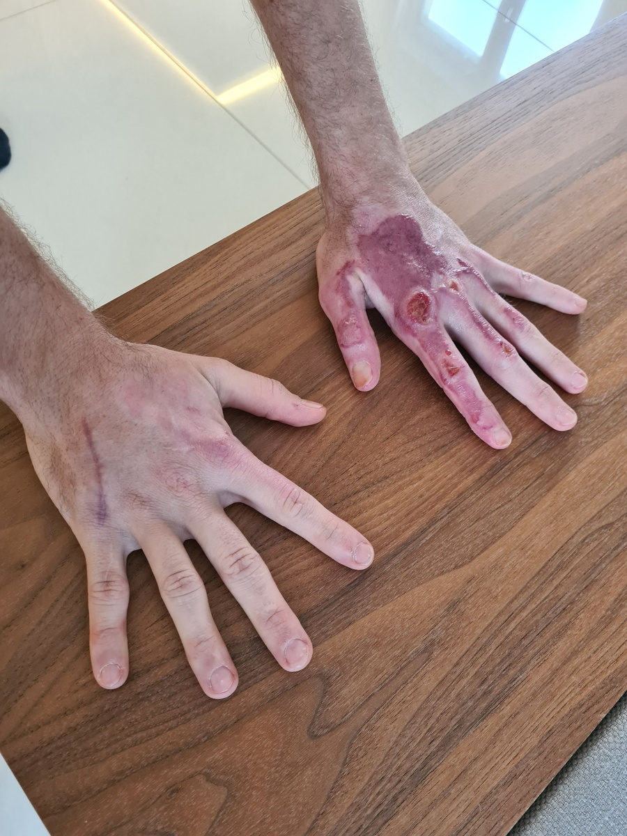 "Dressing fully off and Petrus happy," he said on Twitter above a picture of him cradling the family pet cat and another close up of his hands, the left looking purple and raw.