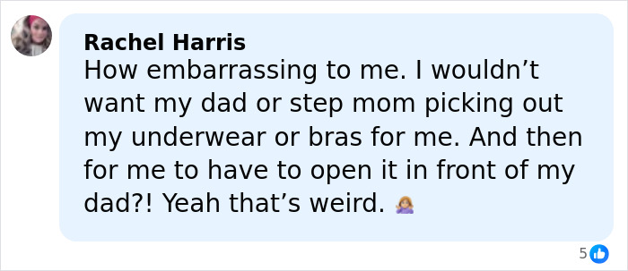 “Weird — I’d never take lingerie from my dad,” one person wrote, while another added, “They could have just gotten you a gift card for that place. Picking it out themselves is strange as hell.”