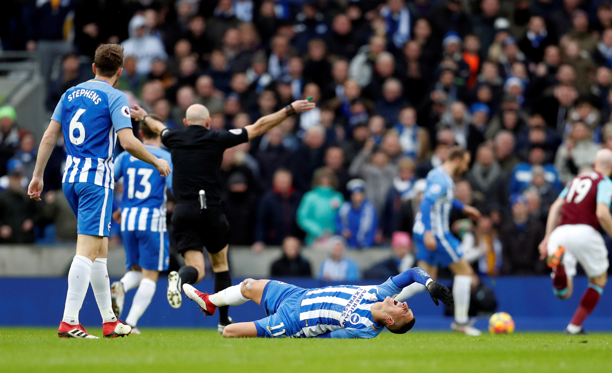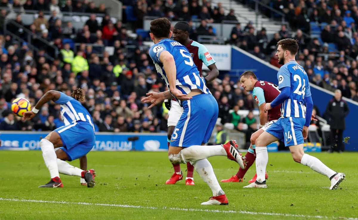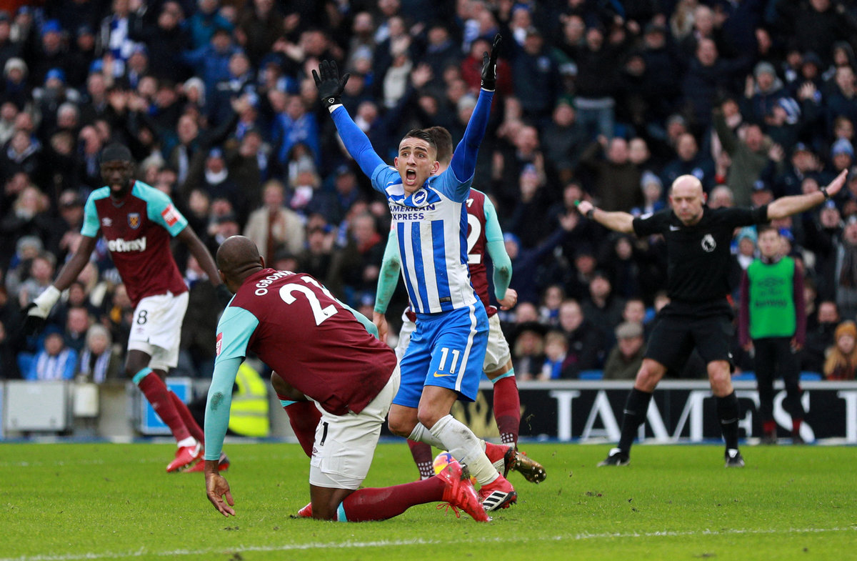 Soccer Football - Premier League - Brighton & Hove Albion vs West Ham United - The American Express Community Stadium, Brighton, Britain - February 3, 2018 Brighton's Anthony Knockaert lies injured after a foul but referee Roger East plays advantage leading to Glenn Murray scoring their first goal Action Images via Reuters/Matthew Childs Soccer Football - Premier League - Brighton & Hove Albion vs West Ham United - The American Express Community Stadium, Brighton, Britain - February 3, 2018 Brighton's Glenn Murray celebrates with team mates after scoring their first goal Action Images via Reuters/Matthew Childs Soccer Football - Premier League - Brighton & Hove Albion vs West Ham United - The American Express Community Stadium, Brighton, Britain - February 3, 2018 West Ham United manager David Moyes and assistant manager Stuart Pearce Action Images via Reuters/Matthew Childs Soccer Football - Premier League - Brighton & Hove Albion vs West Ham United - The American Express Community Stadium, Brighton, Britain - February 3, 2018 Brighton's Anthony Knockaert appeals for handball against West Ham United's Angelo Ogbonna REUTERS/Ian Walton Soccer Football - Premier League - Brighton & Hove Albion vs West Ham United - The American Express Community Stadium, Brighton, Britain - February 3, 2018 West Ham United's Javier Hernandez scores their first goal REUTERS/Ian Walton Soccer Football - Premier League - Brighton & Hove Albion vs West Ham United - The American Express Community Stadium, Brighton, Britain - February 3, 2018 West Ham United's Javier Hernandez celebrates scoring their first goal Action Images via Reuters/Matthew Childs Soccer Football - Premier League - Brighton & Hove Albion vs West Ham United - The American Express Community Stadium, Brighton, Britain - February 3, 2018 West Ham United's Javier Hernandez scores their first goal Action Images via Reuters/Matthew Childs Soccer Football - Premier League - Brighton & Hove Albion vs West Ham United - The American Express Community Stadium, Brighton, Britain - February 3, 2018 Brighton's Glenn Murray in action with West Ham United's Mark Noble REUTERS/Ian Walton Soccer Football - Premier League - Brighton & Hove Albion vs West Ham United - The American Express Community Stadium, Brighton, Britain - February 3, 2018 Brighton’s Jose Izquierdo scores their second goal REUTERS/Ian WaltonSoccer Football - Premier League - Brighton & Hove Albion vs West Ham United - The American Express Community Stadium, Brighton, Britain - February 3, 2018 Brighton’s Jose Izquierdo celebrates with Ezequiel Schelotto after scoring their second goal Action Images via Reuters/Matthew ChildsSoccer Football - Premier League - Brighton & Hove Albion vs West Ham United - The American Express Community Stadium, Brighton, Britain - February 3, 2018 Brighton’s Solly March in action with West Ham United's Aaron Cresswell Action Images via Reuters/Matthew Childs Soccer Football - Premier League - Brighton & Hove Albion vs West Ham United - The American Express Community Stadium, Brighton, Britain - February 3, 2018 Brighton’s Jose Izquierdo in action with West Ham United's Mark Noble REUTERS/Ian Walton Soccer Football - Premier League - Brighton & Hove Albion vs West Ham United - The American Express Community Stadium, Brighton, Britain - February 3, 2018 Brighton's Pascal Gross celebrates with team mates after scoring their third goal REUTERS/Ian Walton Soccer Football - Premier League - Brighton & Hove Albion vs West Ham United - The American Express Community Stadium, Brighton, Britain - February 3, 2018 West Ham United's James Collins looks dejected after the match Action Images via Reuters/Matthew Childs