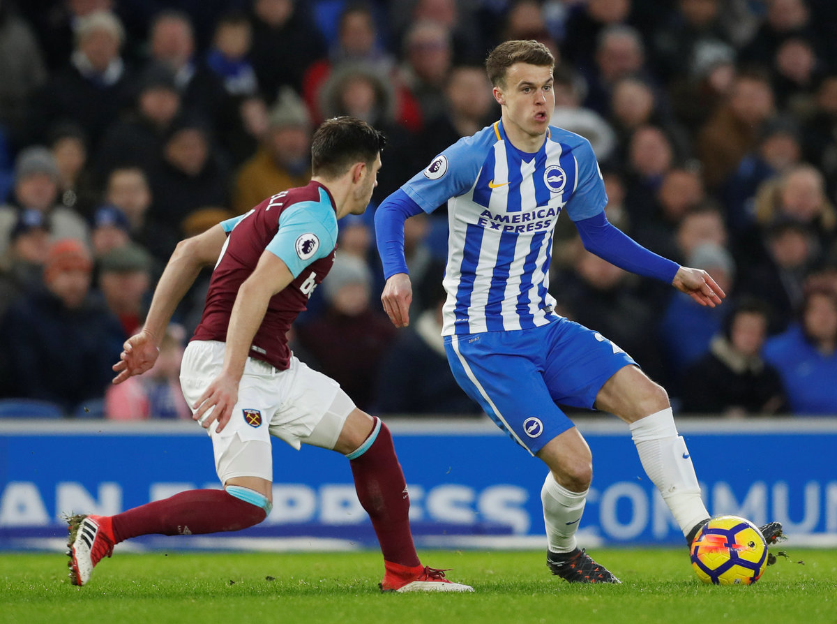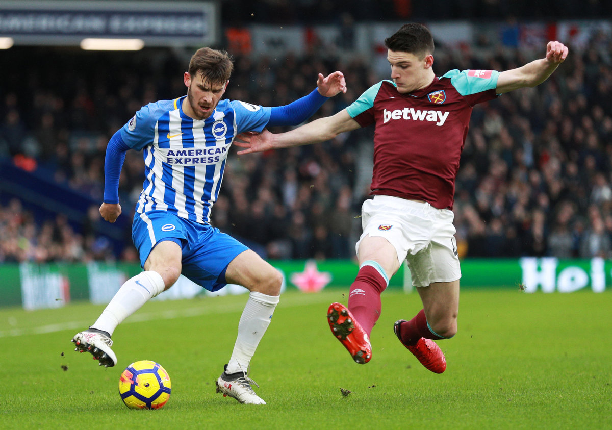 Soccer Football - Premier League - Brighton & Hove Albion vs West Ham United - The American Express Community Stadium, Brighton, Britain - February 3, 2018 Brighton's Pascal Gross in action with West Ham United's Declan Rice REUTERS/Ian Walton