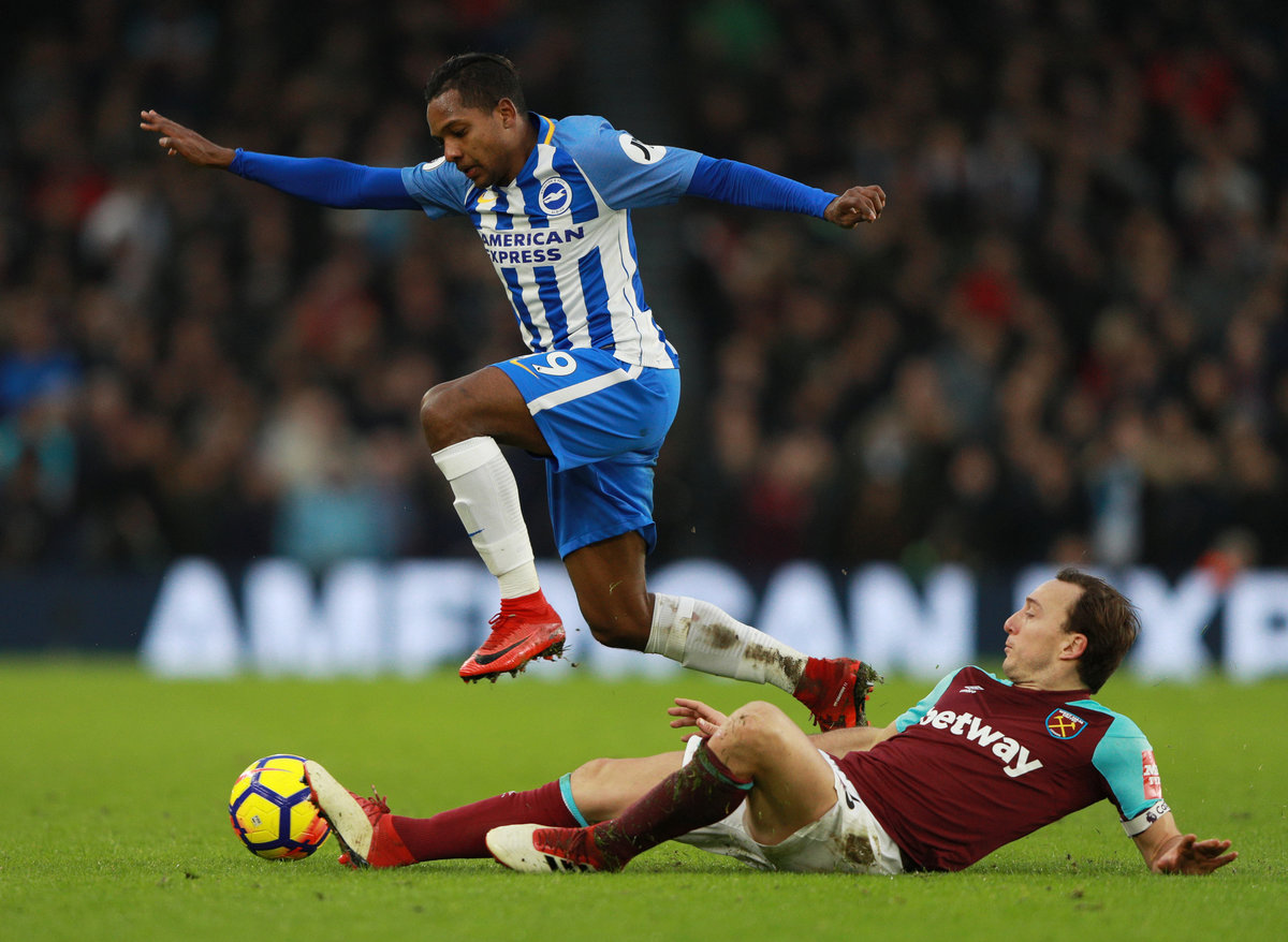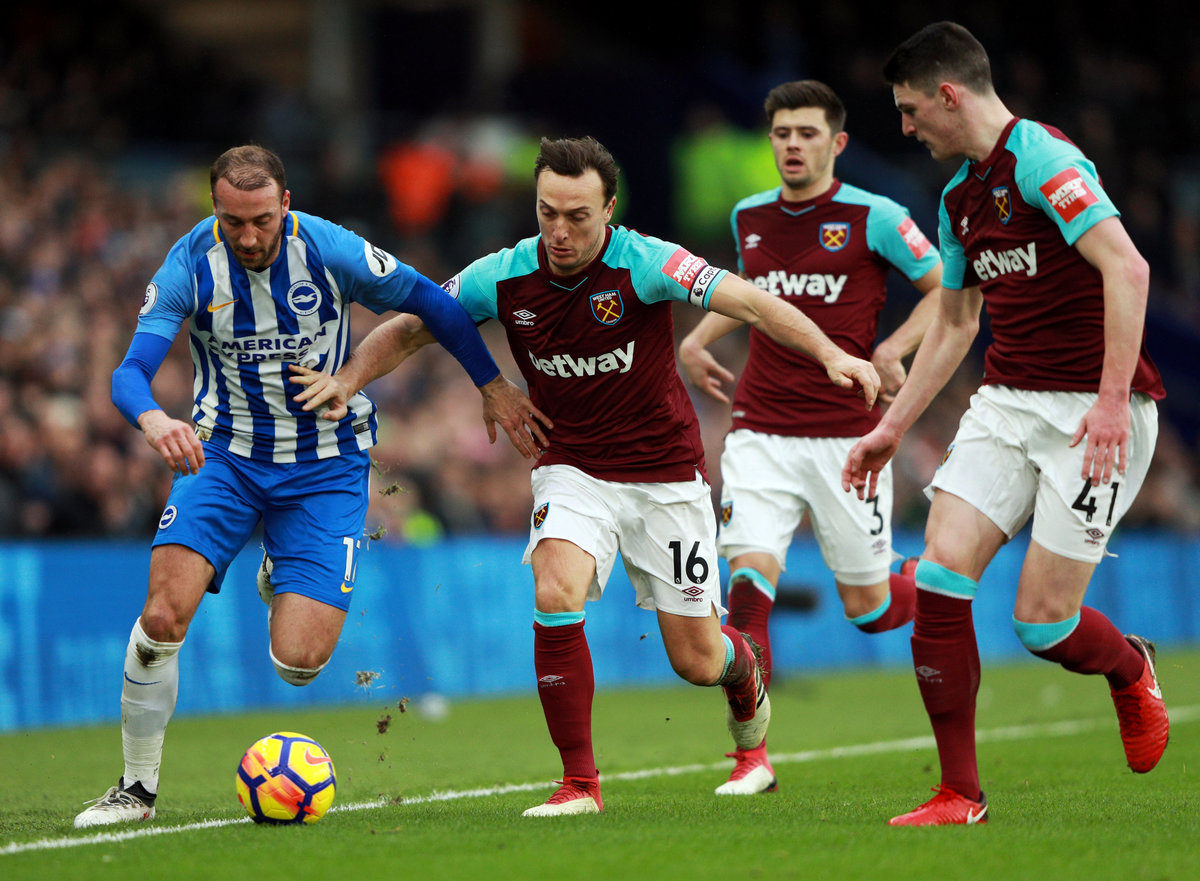 West Ham's midweek signing from Preston North End, striker Jordan Hugill, came off the bench but Brighton held on to complete their first league double over West Ham and move level with the 12th placed visitors on 27 points.