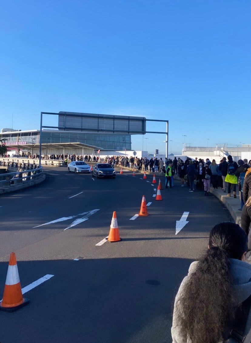 Heavy fog caused massive queues through security and flight delays at Sydney Airport on Monday, with travellers waiting in lines stretching outside the terminal.