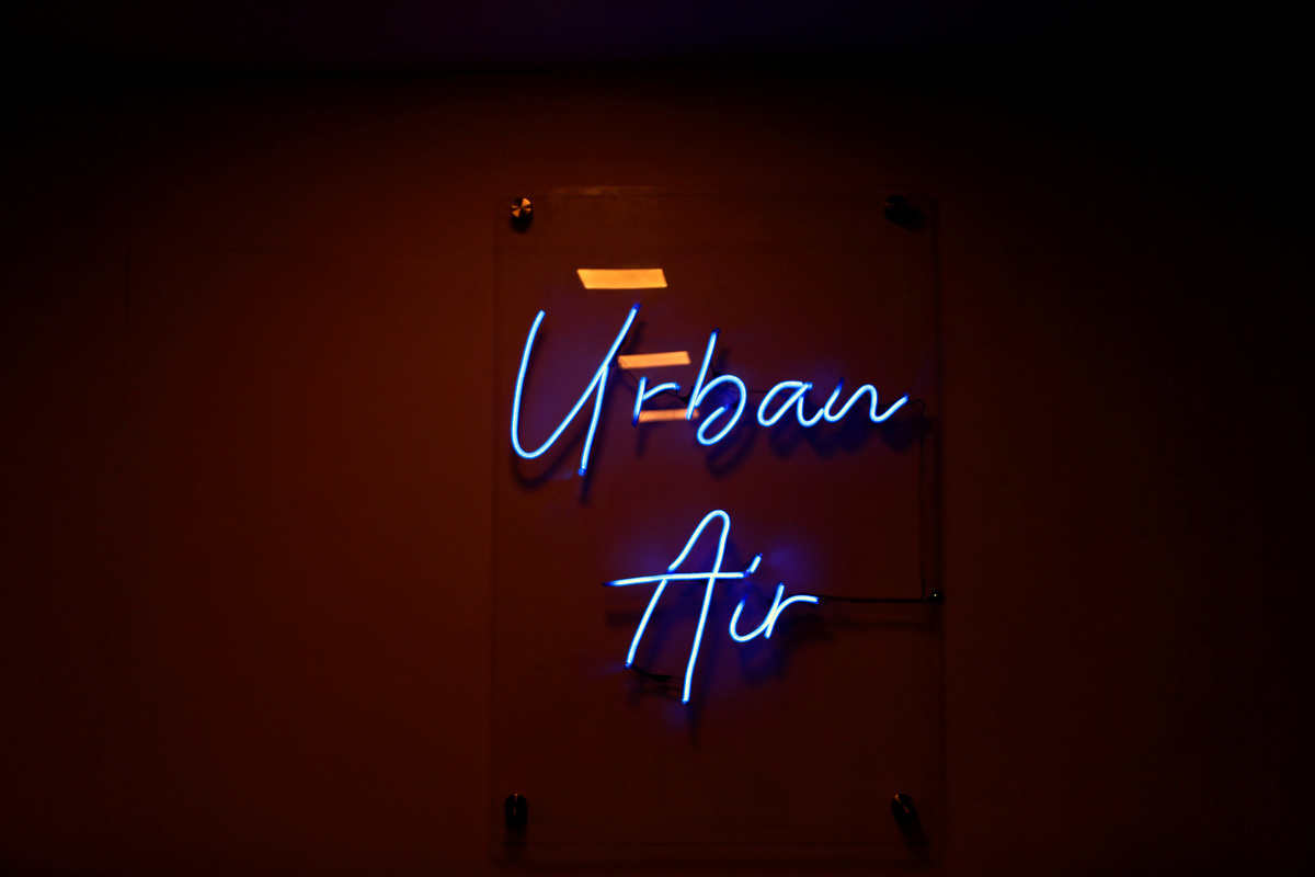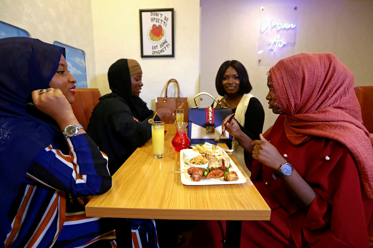 The diners at Urban Air in the Nigerian capital Abuja sit on plush white seats and peruse a flight-themed cocktail menu beside windows illustrated with blue skies and puffy white clouds.
