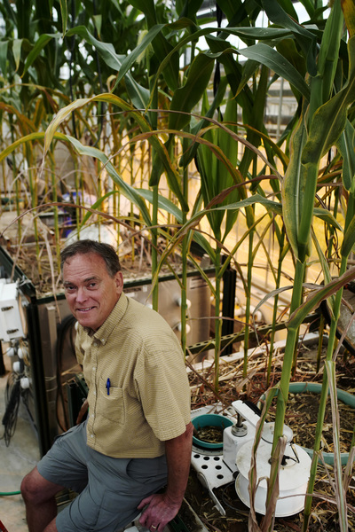 John Baker, research leader for the Agricultural Research Service of the U.S. Department of Agriculture, is also using the greenhouse corn to study a more immediate problem: the amount of nitrogen fertilizer that runs off farm fields as nitrate or is changed to nitrous oxide and escapes to the atmosphere. He is also studying the relationship between spring rains and extra water applied to replicate snowmelt and whether that changes the nitrate levels moving through the soil.