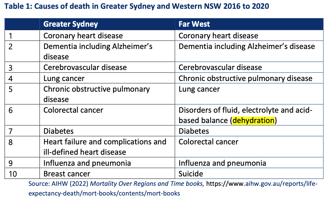 More women in far-western New South Wales are dying from dehydration and other renal conditions than from breast cancer and men are dying by suicide at two times the rate compared to those living in Sydney.