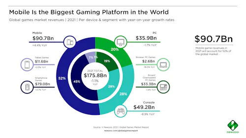 Mobile gaming is also extremely lucrative, with revenue that exceeds that of PC and console gaming. Mobile gaming made $90.7 billion globally last year, compared to PC gaming’s $35.9 billion and console gaming’s $49.2 billion. This means that mobile gaming made $5.6 billion more in 2021 than all PC and console gaming combined.