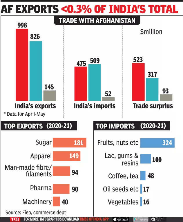 India’s trade with Afghanistan was not large, with the country accounting for less than 0.3% of India’s exports and 0.1% of imports, with overall trade during the last fiscal year pegged at $1.4 billion.