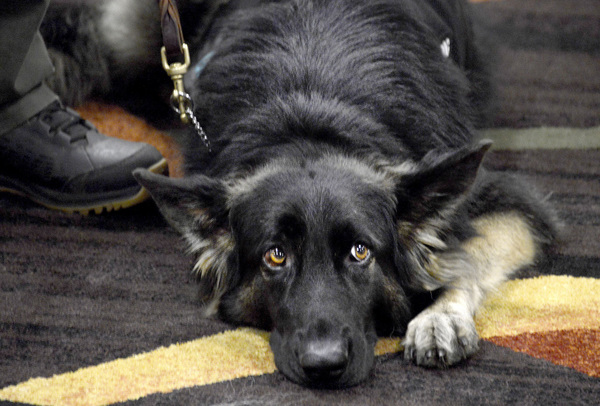 The four German shepherds came with their partners Friday to the Marriott City Center for a refresher training session with Carol Borden, whose organization since 2009 has trained and placed medical service dogs with 170 people, many of them veterans.