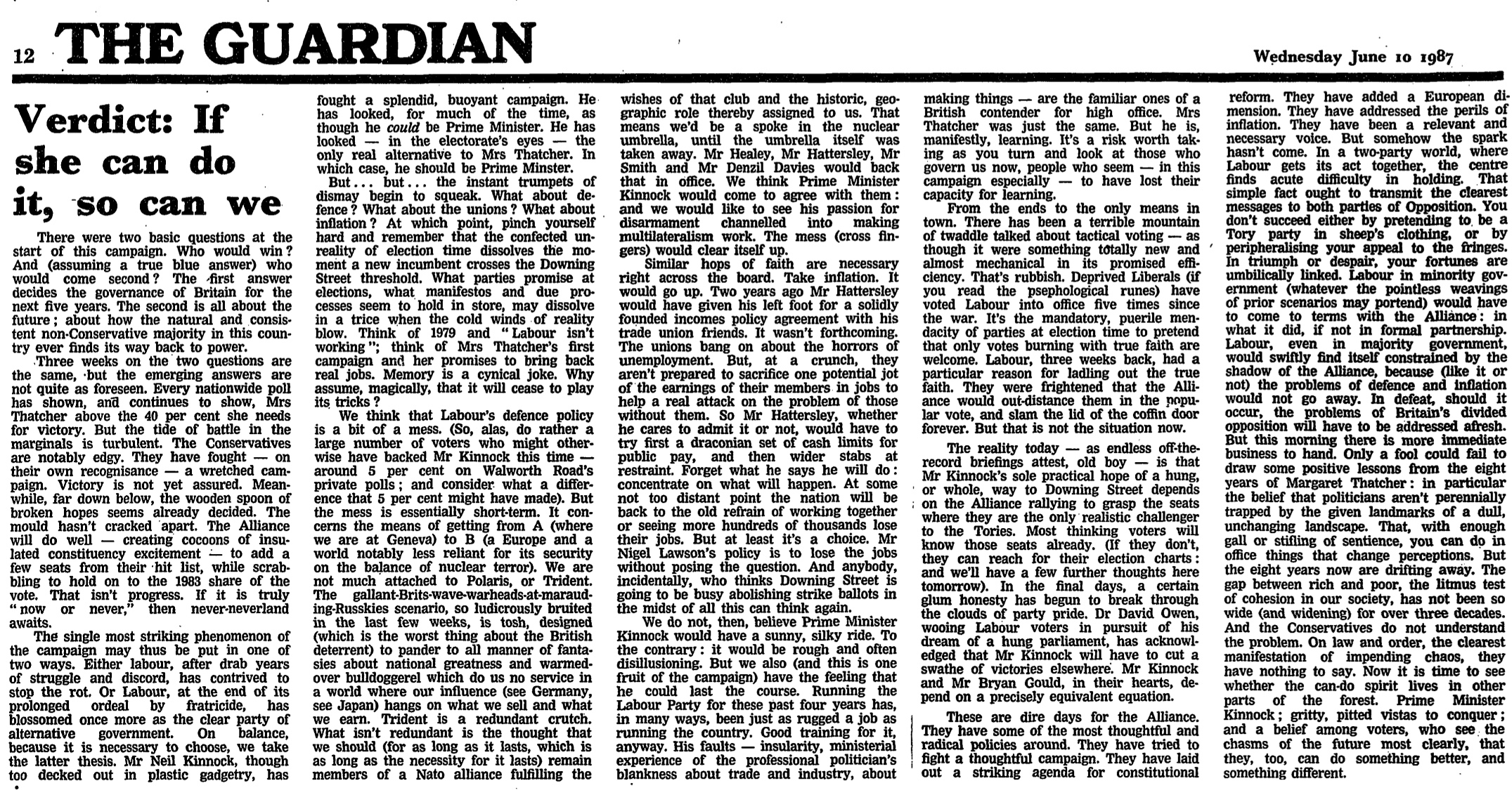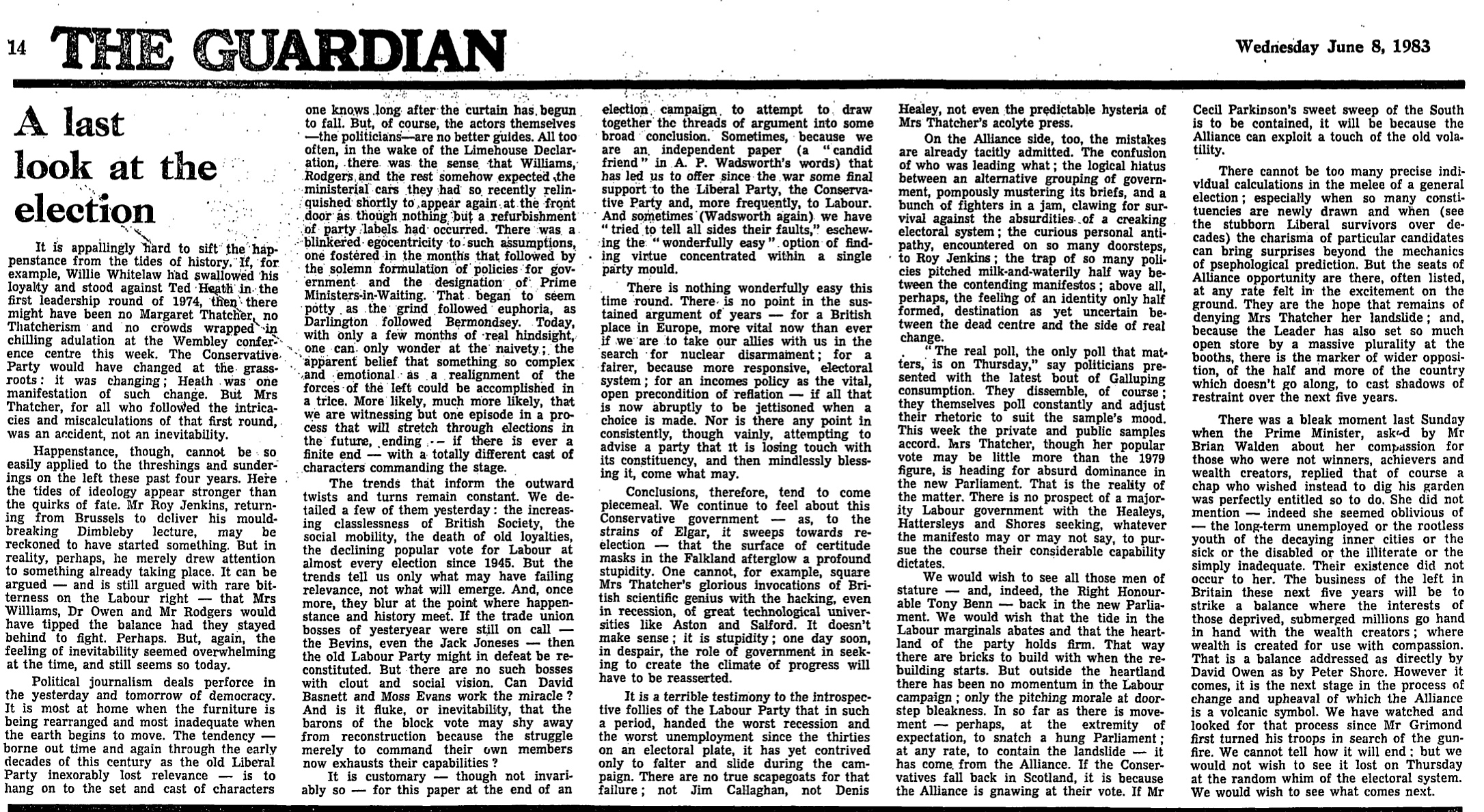 ‘The business of the left in Britain these next five years will be to strike a balance where the interests of those deprived, submerged millions go hand in hand with the wealth creators...That is a balance addressed as directly by David Owen as by Peter Shore. However it comes, it is the next stage in the process of change and upheaval of which the alliance is a volcanic symbol...We cannot tell how it will end: but we would not wish to see it lost on Thursday at the random whim of the electoral system. We would wish to see what comes next.’