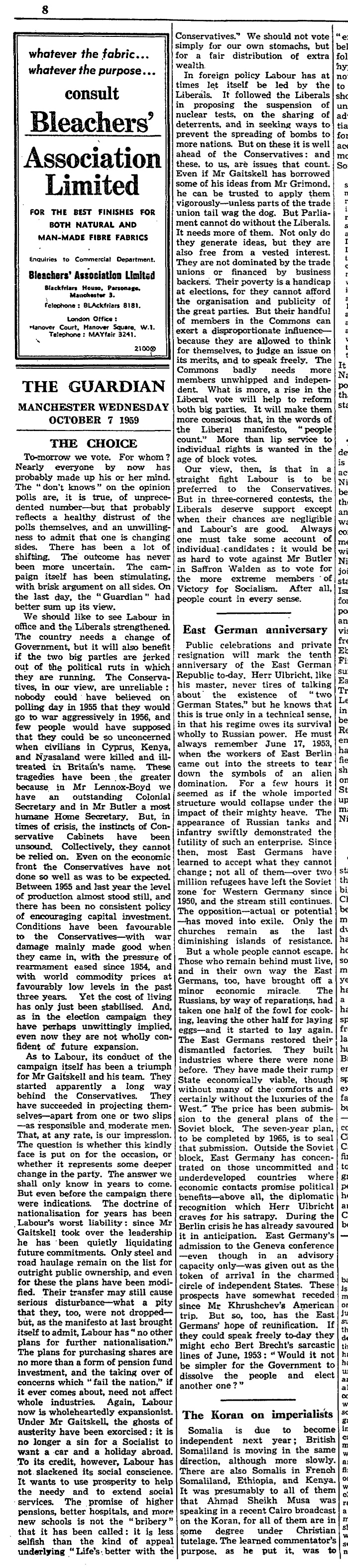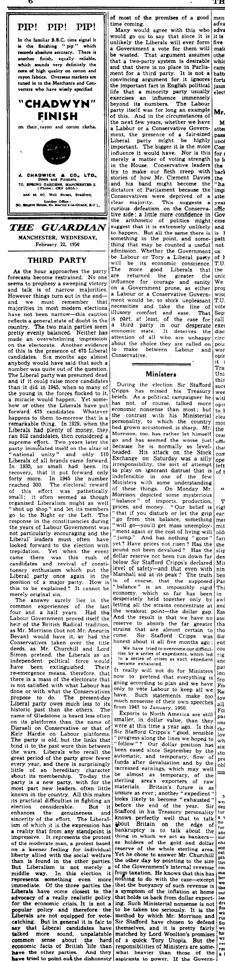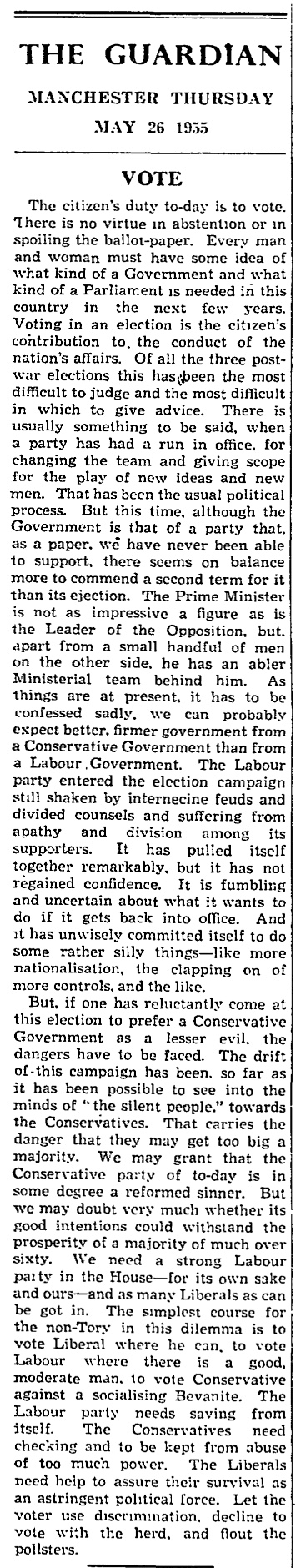 ‘We need a strong Labour party in the House - for its own sake and ours - and as many Liberals as can be got in. The simplest course for the non-Tory in this dilemma is to vote Liberal where he can, to vote Labour where there is a good, moderate man, to vote Conservative against a socialising Bevanite.’