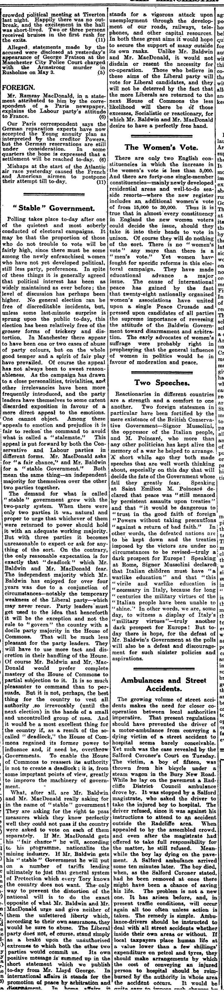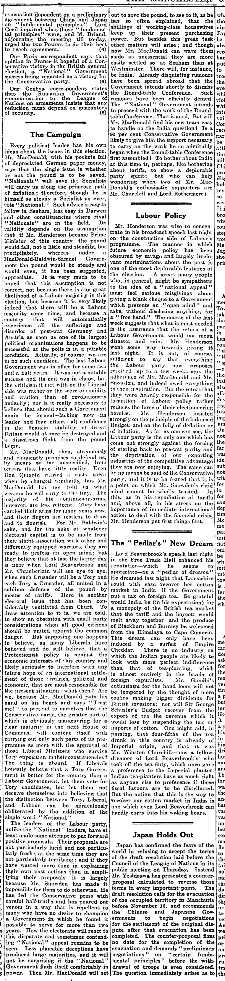 ‘...in educational reform; in the recasting of our systems of unemployment relief, and a score of other issues, trust in a Conservative Prime Minister is not enough. A big majority may suit his ease and convenience. But we do not want another four years of easy drift. The smaller the margin on which he has to work, the more acute, constructive critics there are on the Liberal and Labour benches, and the more responsive will the Government be to progressive opinion.’