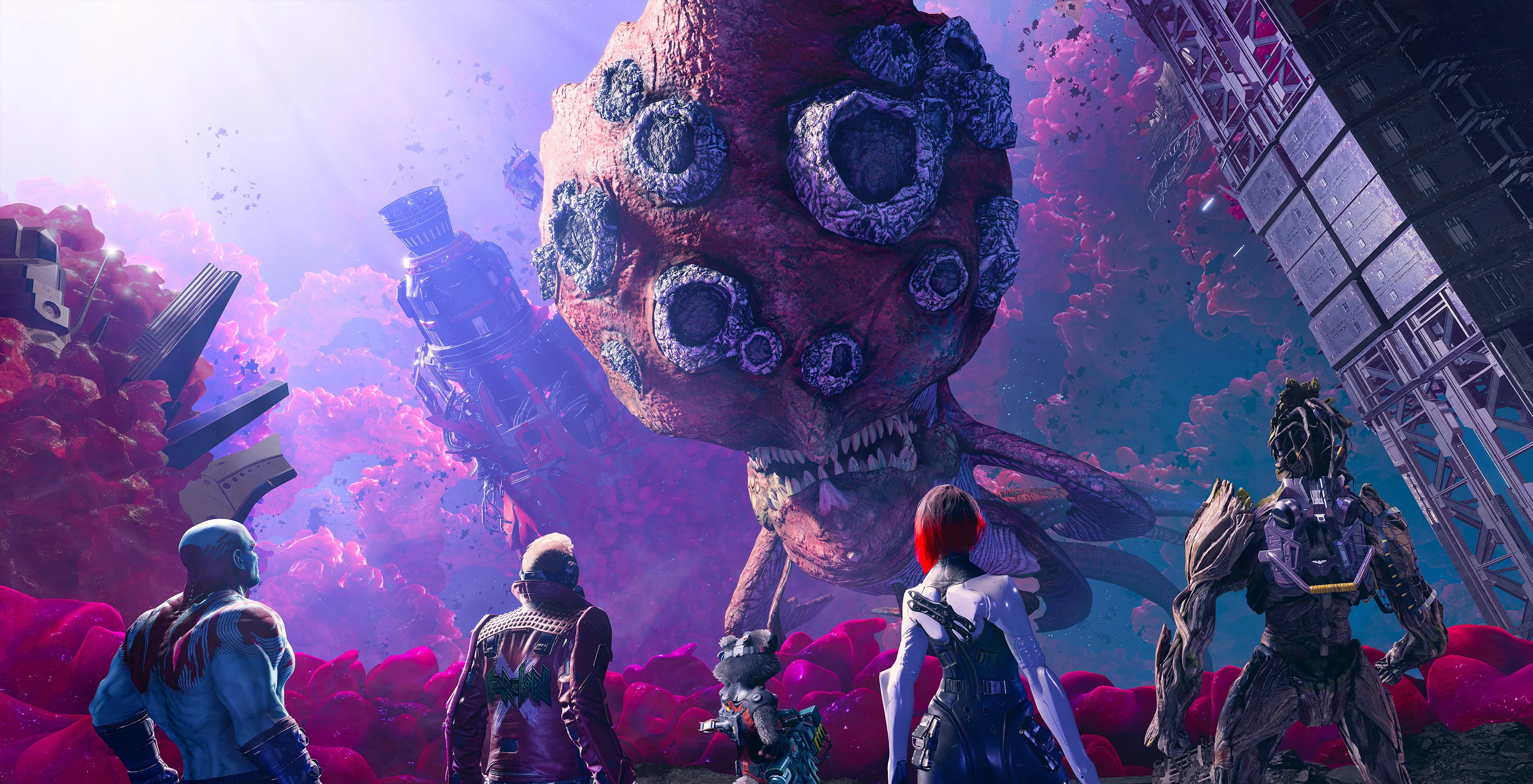 The combat in Guardians of the Galaxy is weird. The game leans so heavily on coordinating team attacks like a real-time strategy game that it almost forgets to emphasize the action. Enemies have a Stagger meter like in Final Fantasy VII Remake, and with a few quick button presses, you command a Guardian to execute a move. Drax deals a lot of Stagger with his knives, and Gamora is great at delivering a high-damage killing blow. Groot might use his vines to subdue a crowd of smaller enemies, and then Rocket follows that up with a grenade to wipe them out. It’s often almost too much to juggle. Meanwhile, you just hold down the primary fire button and hope for the best.