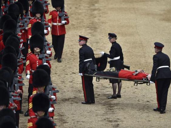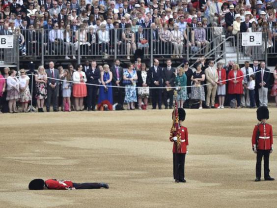 The soldiers wear a heavy uniform and a bearskin ‘Busby’ hat, which is thought to have contributed towards the collapse, in addition to the warm temperatures.