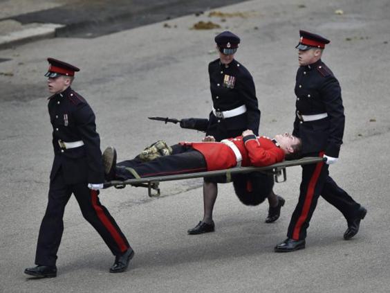 While unidentified soldier's comrades remained still, he was soon attended to by officials and stretchered off the parade ground.