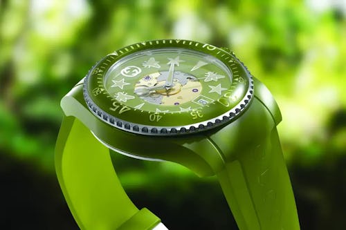 Gucci’s Dive line is based on sporty watches that combine classic and contemporary performance elements. While the classic iterations are made with fabric, rubber, and steel, the luxury house’s bio-based counterpart uses a rubbery plastic as its main material. For even more sustainability, a recycled steel is used for the crown, buckle, and case back.