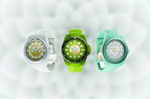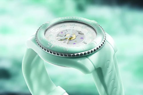 The Dive comes in a small run of colors more lively than the brand’s previous collections. In perhaps a reference to air, earth, and water, you can choose from a white, green, or aquamarine. Each color coats the bio-based strap and watch face with gold accents appearing on the dial. Gucci then engraves its logo into the back of the case, the buckle, and the crown.