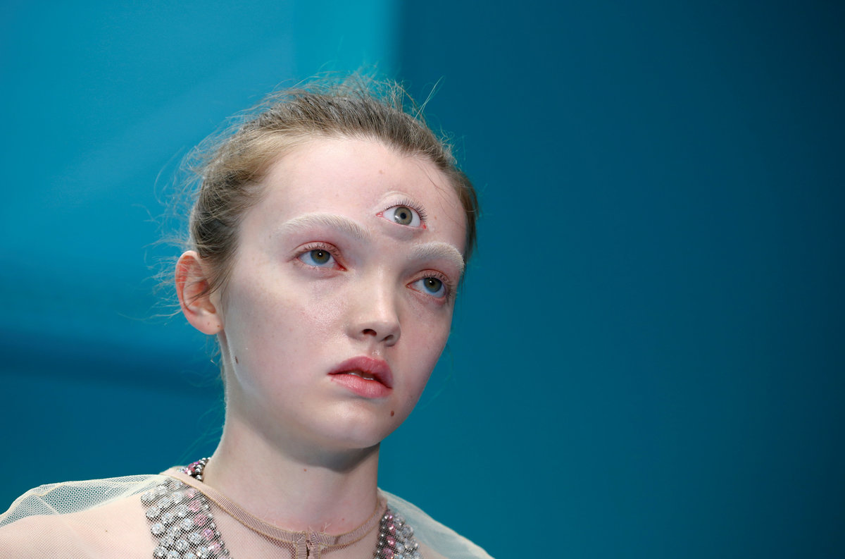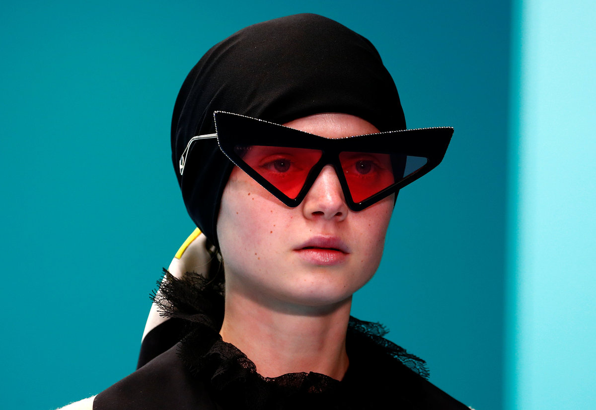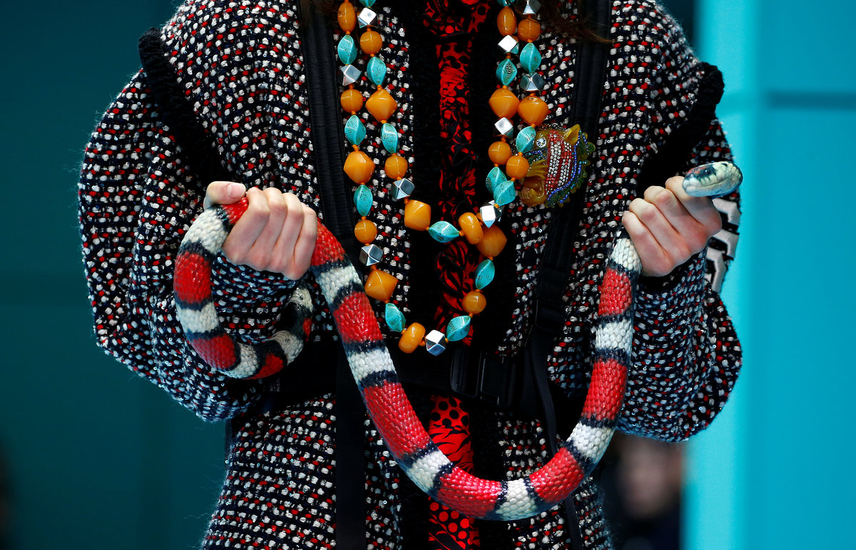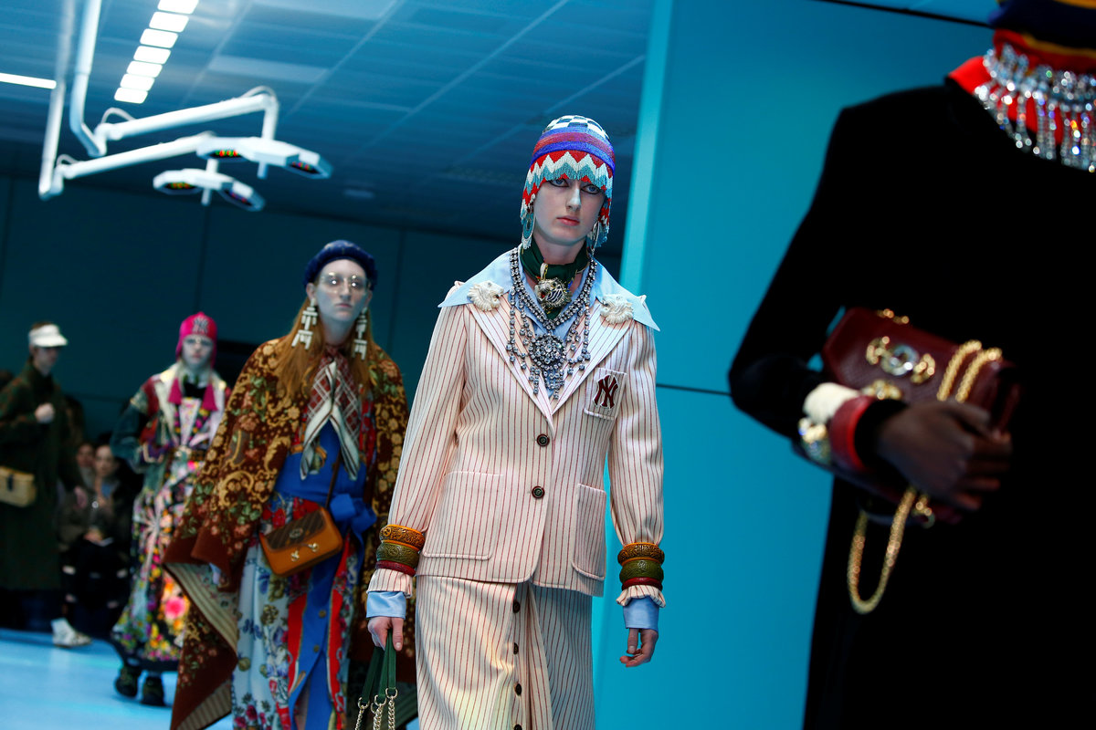 A style note said the different designs embodied Gucci's concept of "pluriverse" and drew inspiration from Donna Haraway's 'Cyborg Manifesto", a 1984 essay rejecting the idea of rigid boundaries, particularly those separating humans from animals and from machines.