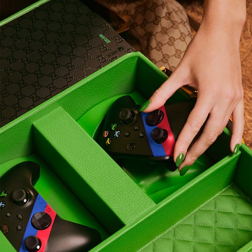 Should buyers ever want to transport their Gucci x Xbox sets — as if they don’t have separate consoles for each house they own — the consoles and controllers come housed in a Gucci hard carry case. Dressed in the luxury brand’s signature monogram print, the trunk features red and blue stripes alongside yellow and green accents nodding to Xbox’s branding. “XBOX” and “GOOD GAME” are both printed on the luggage, which also includes a yellow tag bearing both Gucci and Xbox’s logos.
