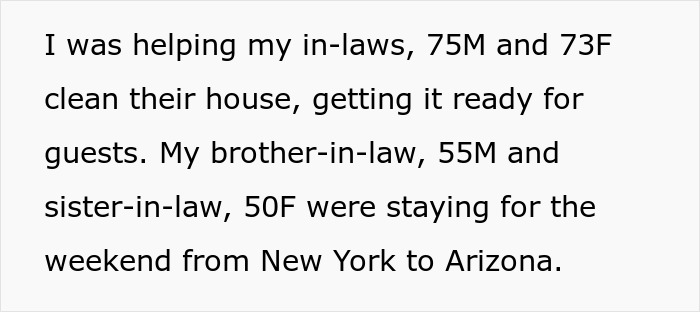 So, the original poster (OP) says that she and her husband are living with his parents, trying to save up for their own house. The author’s spouse has a way older stepbrother, in his fifties, who got married a couple of years ago, and our heroine has only seen her sister-in-law onceat their wedding. Now, the couple has come to visit them.