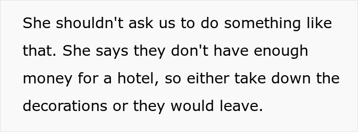 Our heroine said they wouldn’t take down anything, and her mother-in-law supported her in this. The atheist lady threatened to leave immediately, but also said she and her husband couldn’t afford a hotel room. So, our heroine’s stunned mother-in-law had to fork out the cash for his eldest son and daughter-in-law, who left in righteous anger. And the OP decided to vent online a bit.