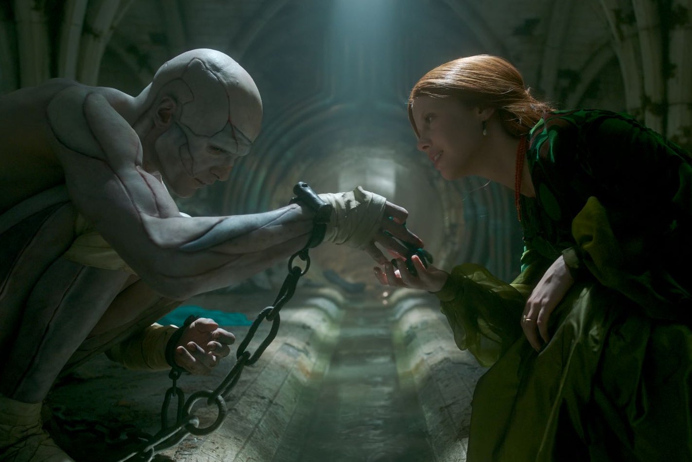The mirror, too, extends to the film’s two major female characters, both played by Mia Goth. One is Claire, Victor’s mother, the sole, nurturing presence in the boy’s life. The other is Elizabeth, William’s fiancee. She represents the Romantic ideals, and looks upon the Creature with true empathy. That Victor finds himself attracted to her – well, that’s a real Freudian pileup, which Del Toro toys with by having him, in adulthood, periodically sipping on milk.