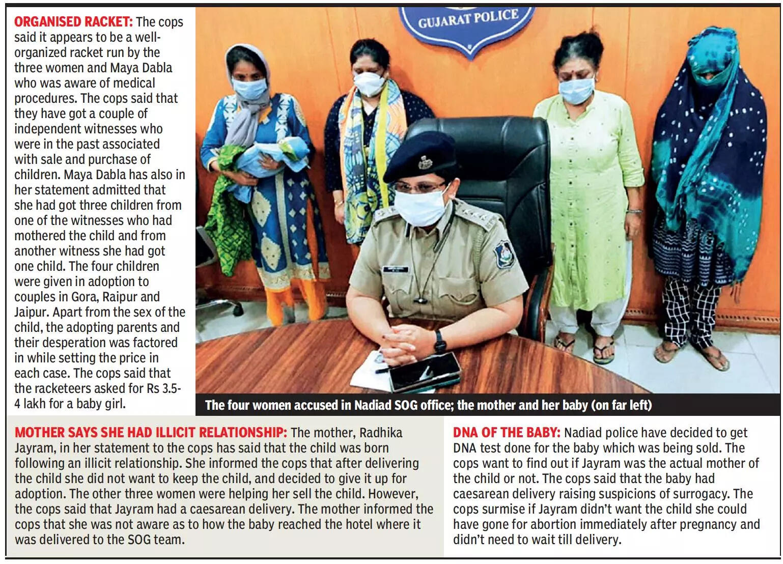 AHMEDABAD: The Nadiad Special Operations Group has arrested four women from Nadiad who were selling a five-day-old male baby for Rs 6 lakh. The mother of the baby was a tribal woman from Madhya Pradesh who had lost her husband five years ago.