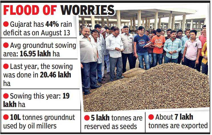 Samir Shah, president of Gujarat state Edible Oils and Oil Seeds Association said, “The average yield per acre is around 400 kg, but if the rains play truant over the next four-five days, it would fall to just around 150kg-200 kg per acre. This means that the overall crop yield would be between 15 lakh to 18 lakh tons.”