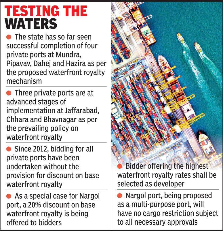 As a special case for Nargol port, the state government has granted discount of 20% on the waterfront royalty for bidding process. Also, the government has granted longer 50-year concession period of a single block period without compensation. The option of discount will lead to better feasibility parameters and shall facilitate the developer in raising capital at a lower cost, said a GMB official.